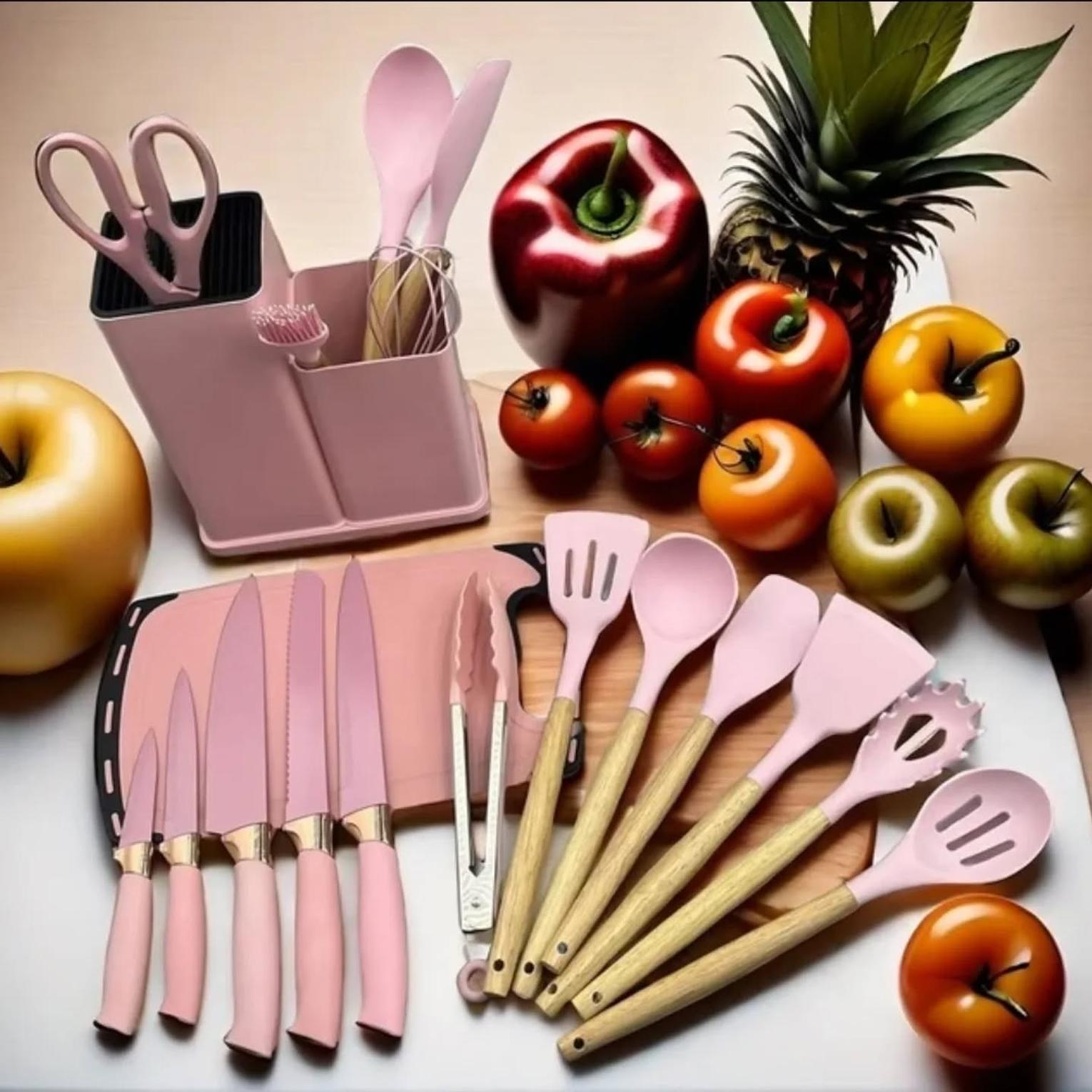 Equip your kitchen fully with this stylish and comprehensive 19pcs Silicone Kitchen Set. It includes a full collection of silicone utensils and stainless steel knives with silicone coatings, all stored in a convenient organizer.