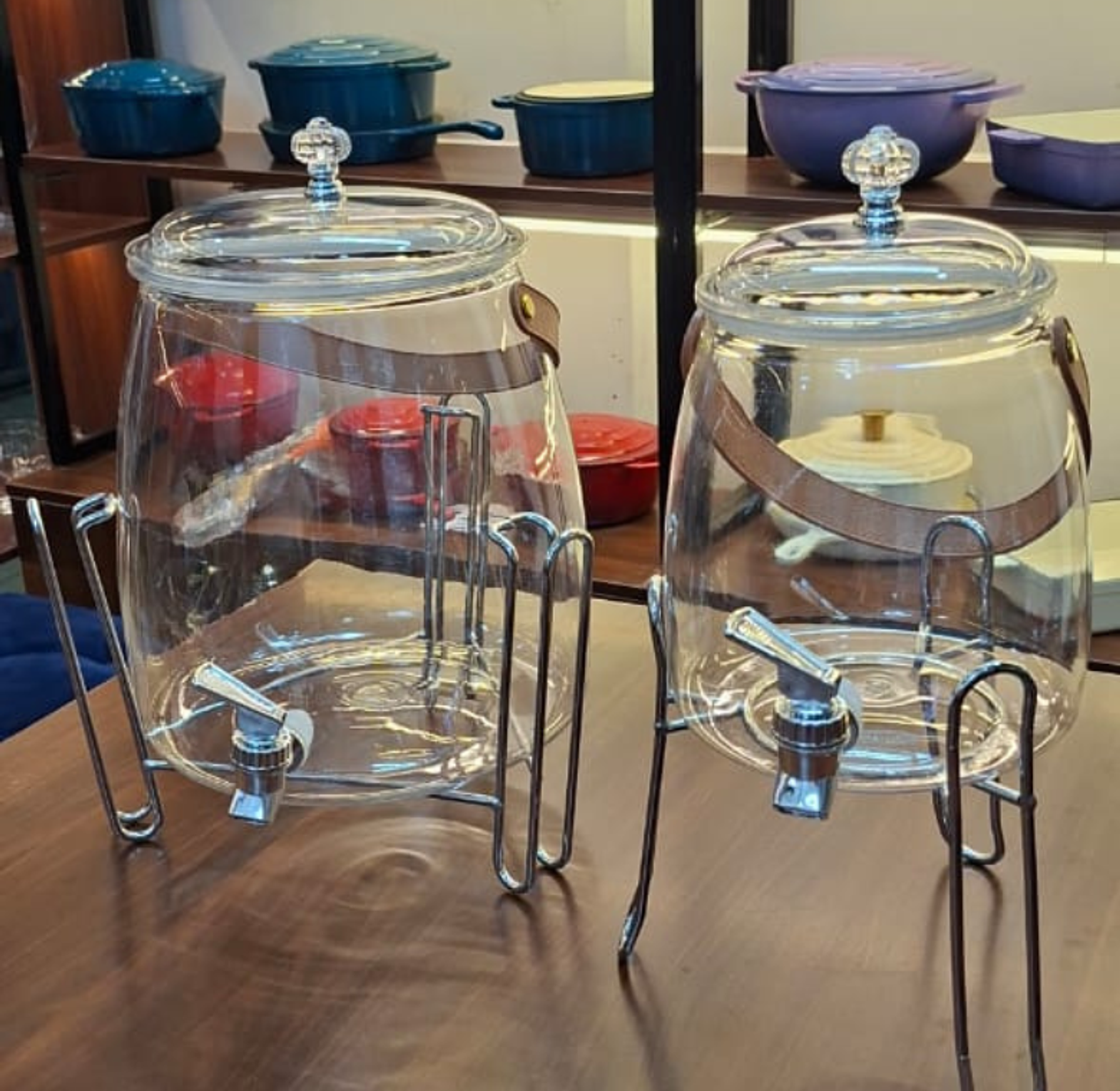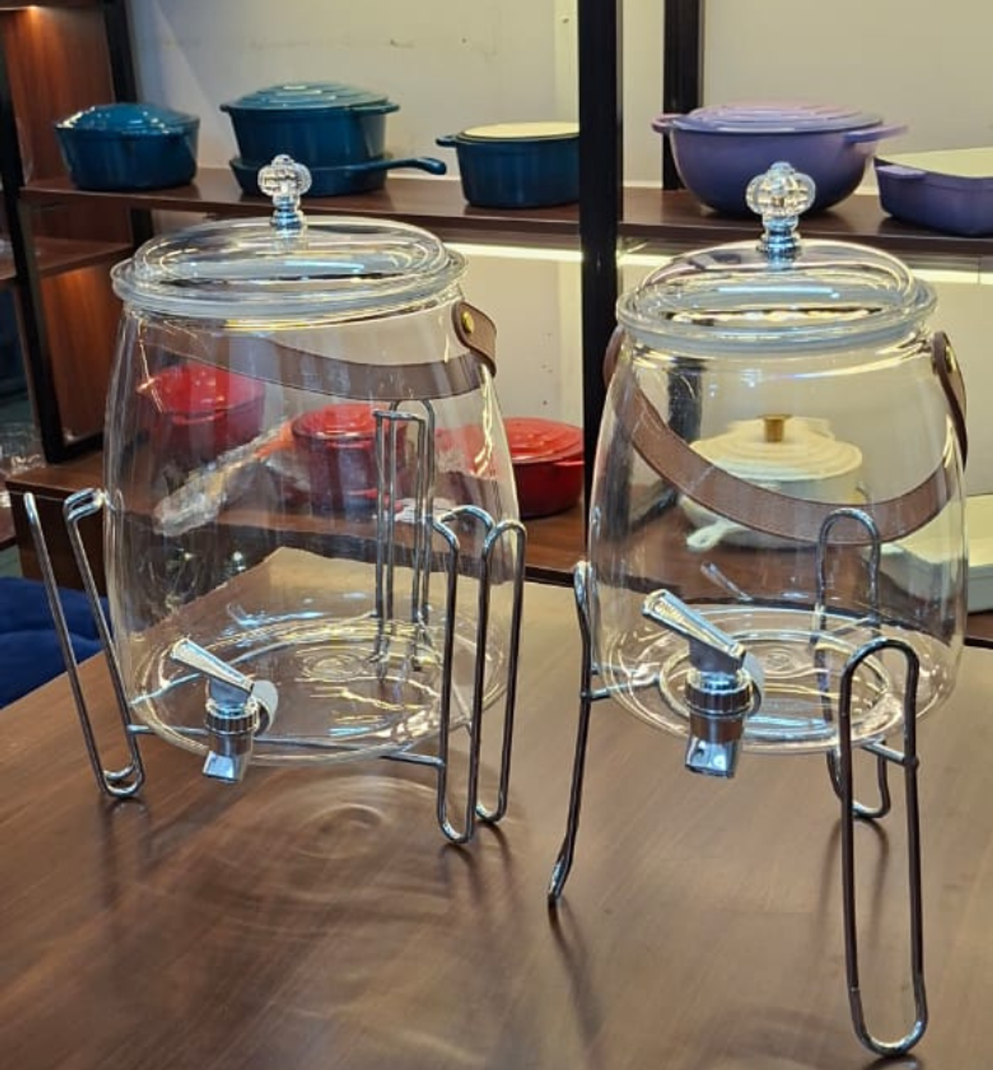 Serve cold drinks elegantly at any gathering with this versatile 2-piece beverage dispenser set, including 5-liter and 2.5-liter containers. Made from durable plastic and featuring a convenient spigot, each jar comes with its own coordinating metallic display stand.