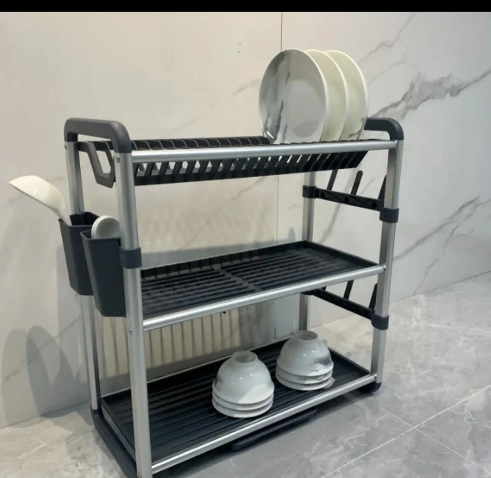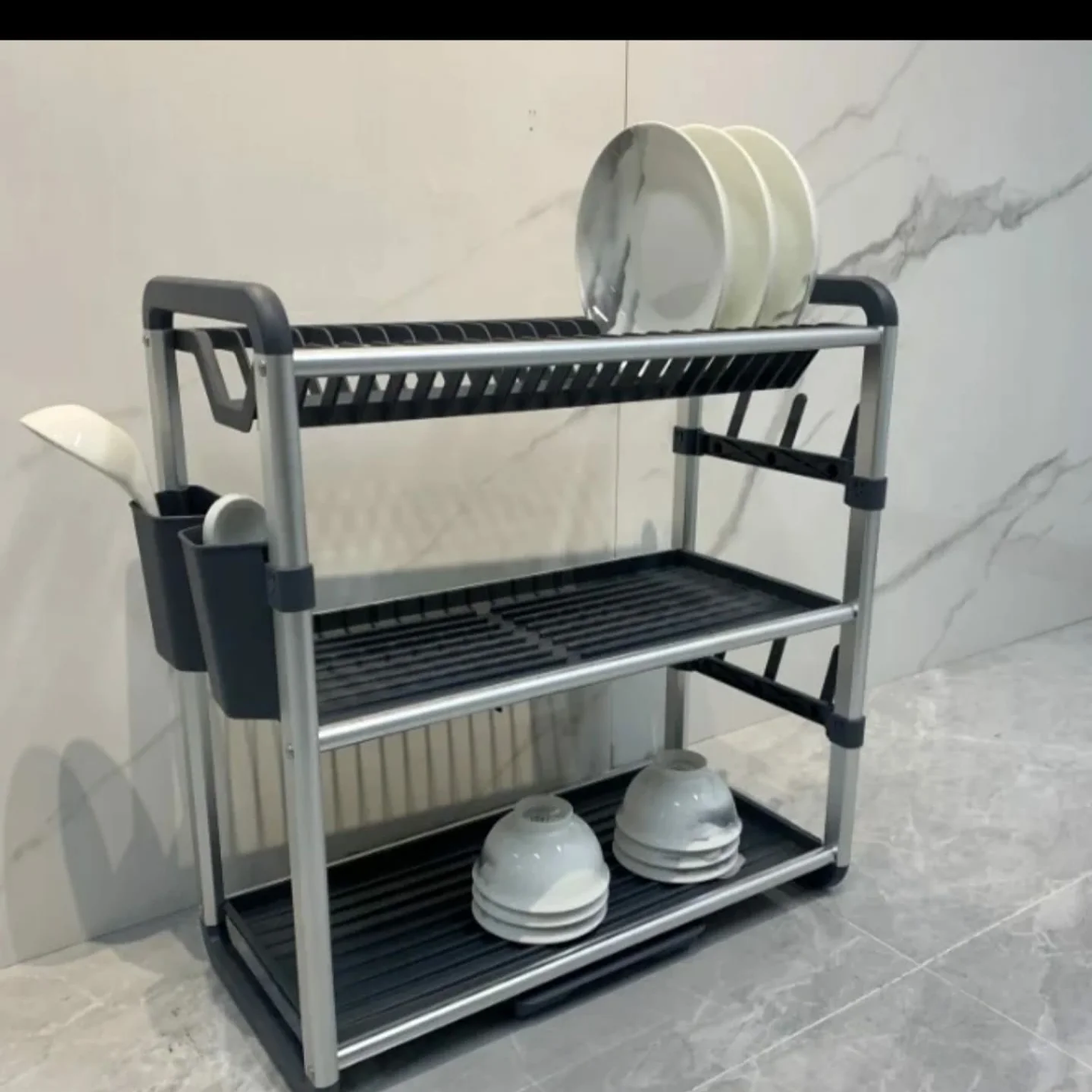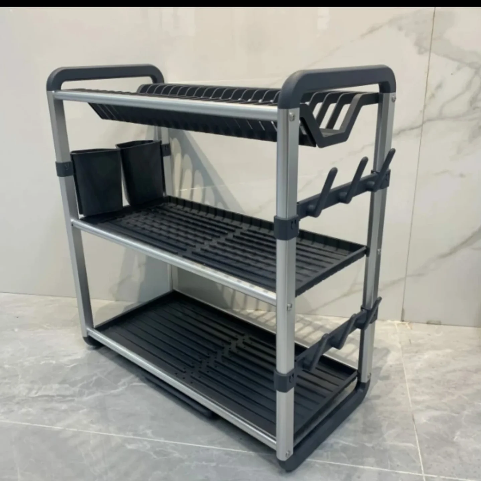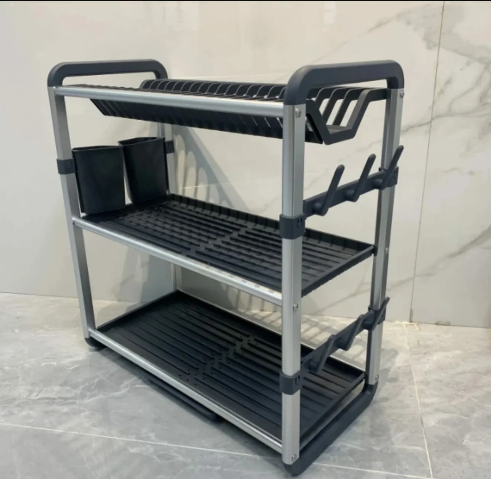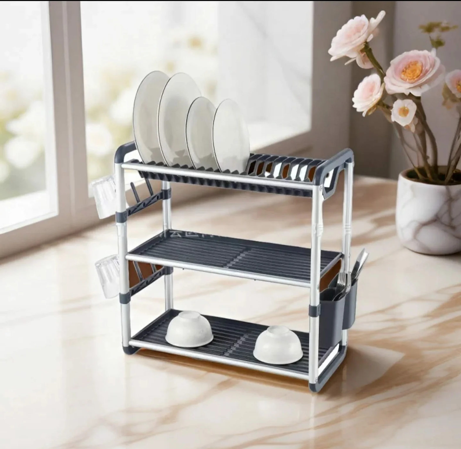 Maximize your counter space with this stylish and functional 3-tier dish rack. Made from premium aluminum that won't rust, it includes dedicated holders for cups and utensils, making dish-drying effortless.