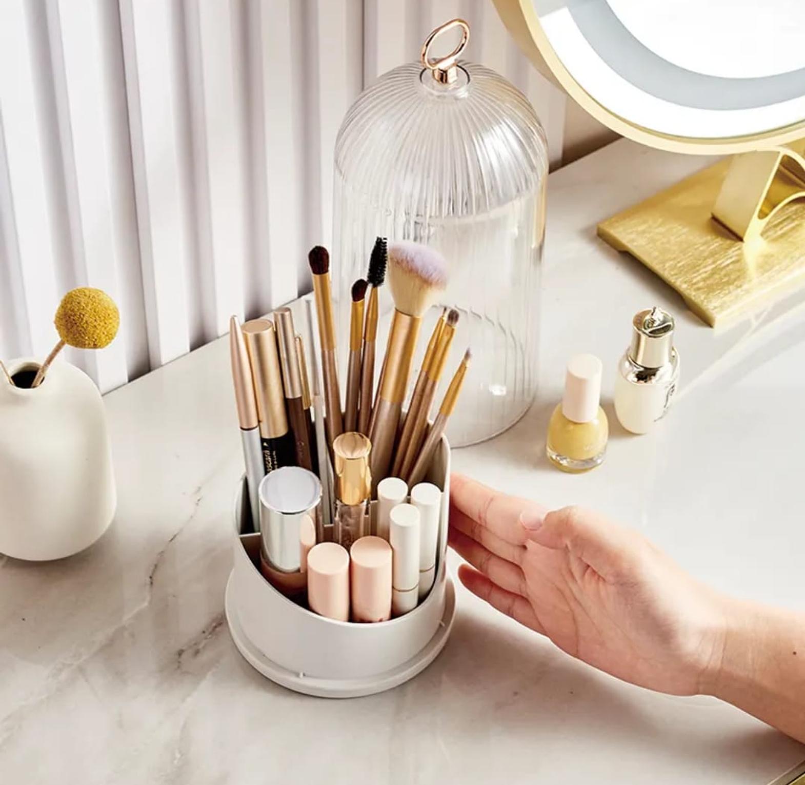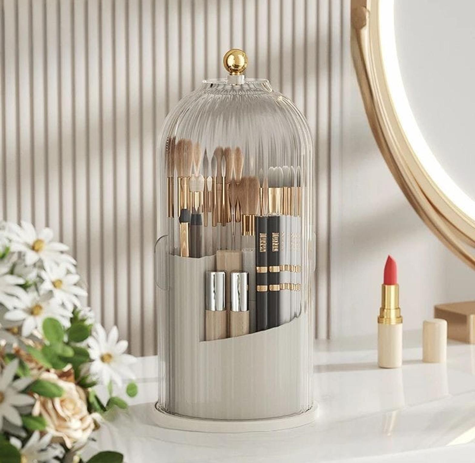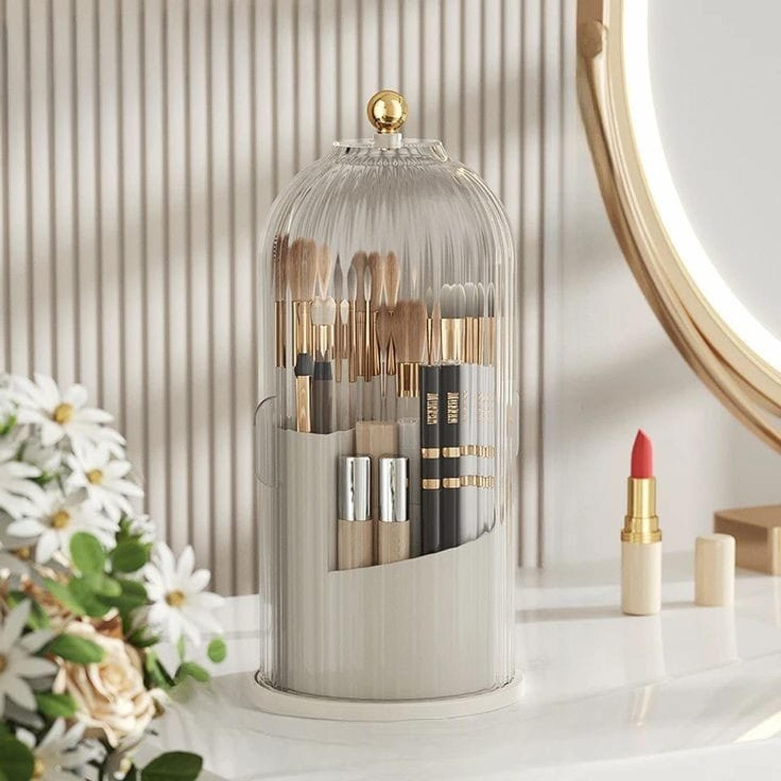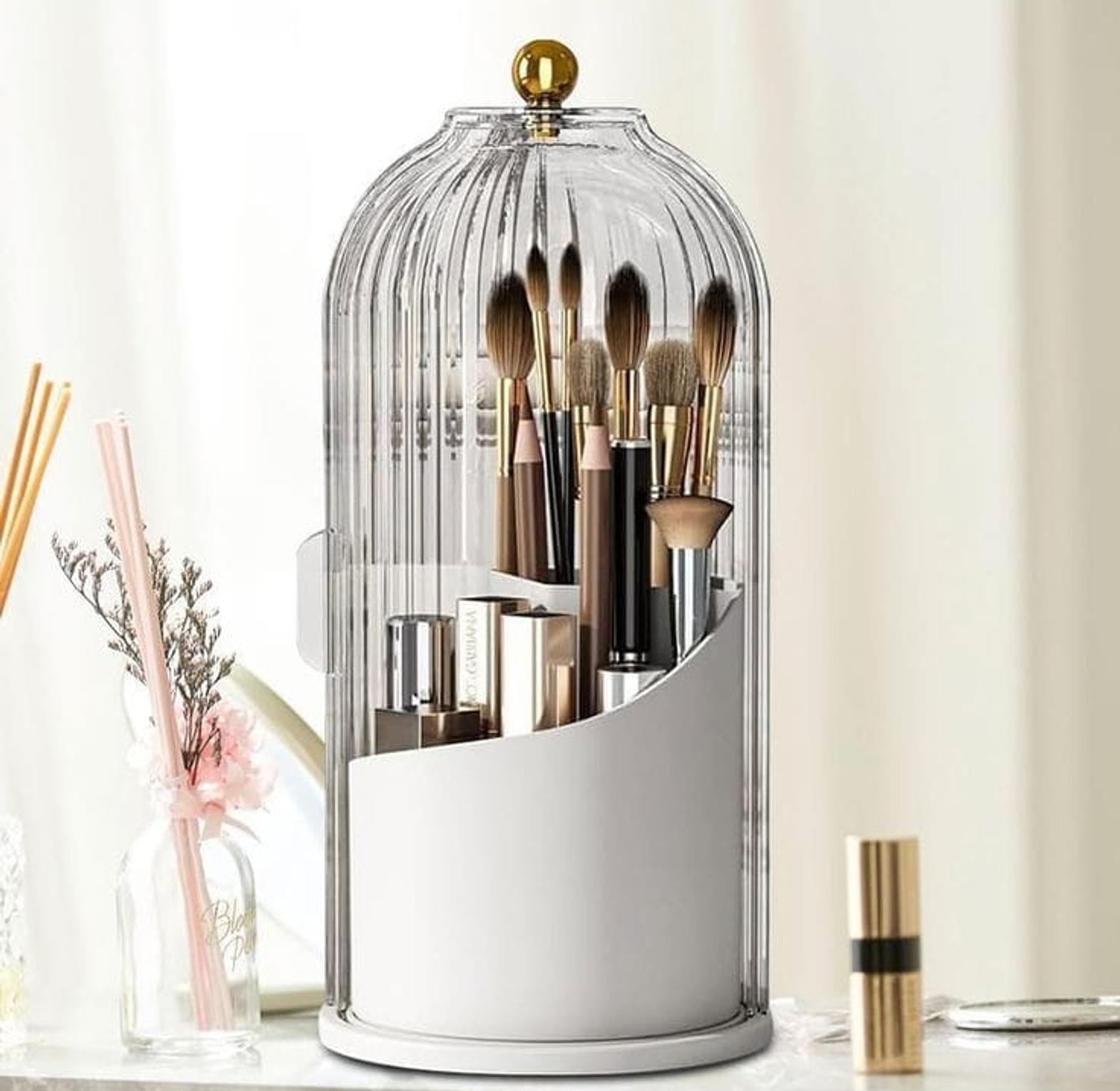 This sleek, birdcage-inspired organizer is the ultimate vanity accessory for makeup enthusiasts and professional artists alike. Designed to blend style with high-level functionality, it protects your expensive brushes from dust and moisture while adding a touch of modern luxury to your dressing table.