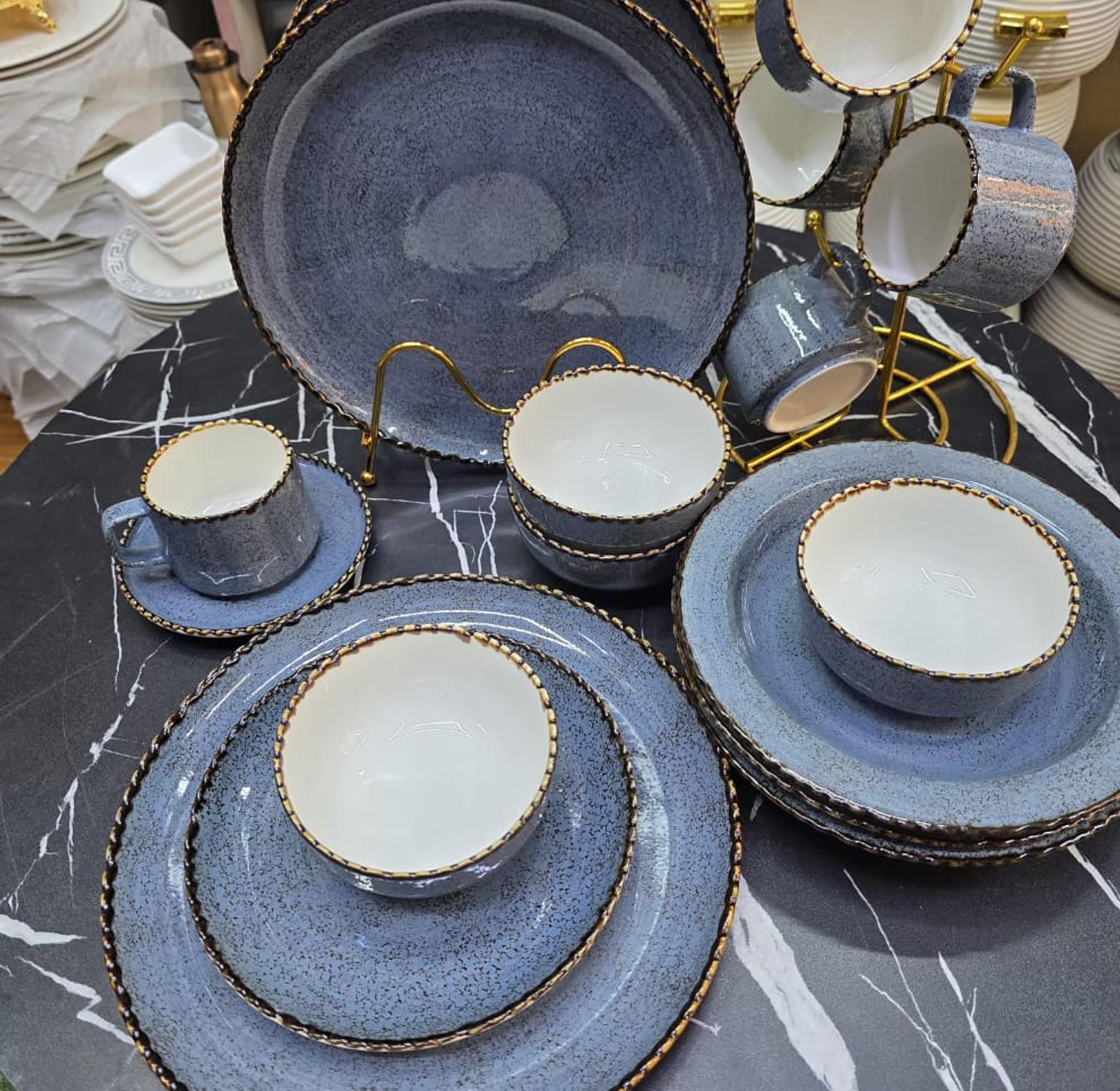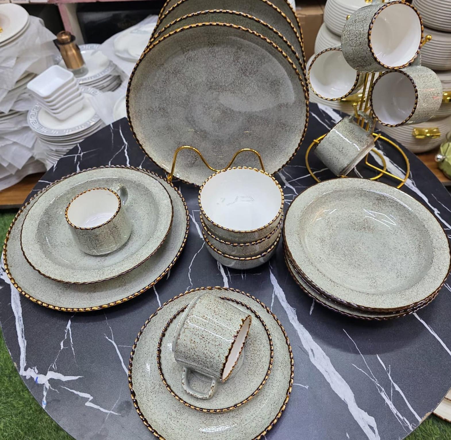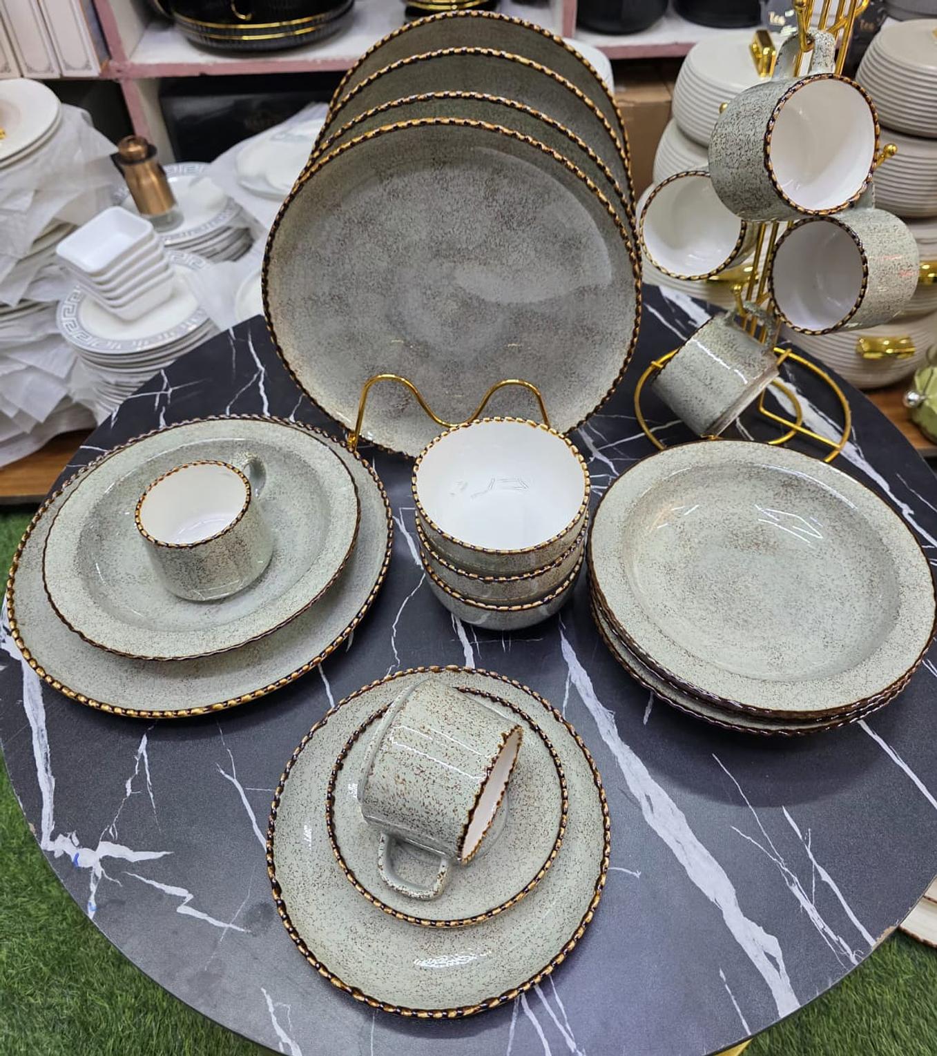 Upgrade your dining experience with this elegant 36-piece European kiln porcelain dinner set, featuring a sophisticated speckled finish and luxurious textured gold rims. This premium quality set is both dishwasher safe and microwaveable, combining high-end luxury with everyday practical convenience.