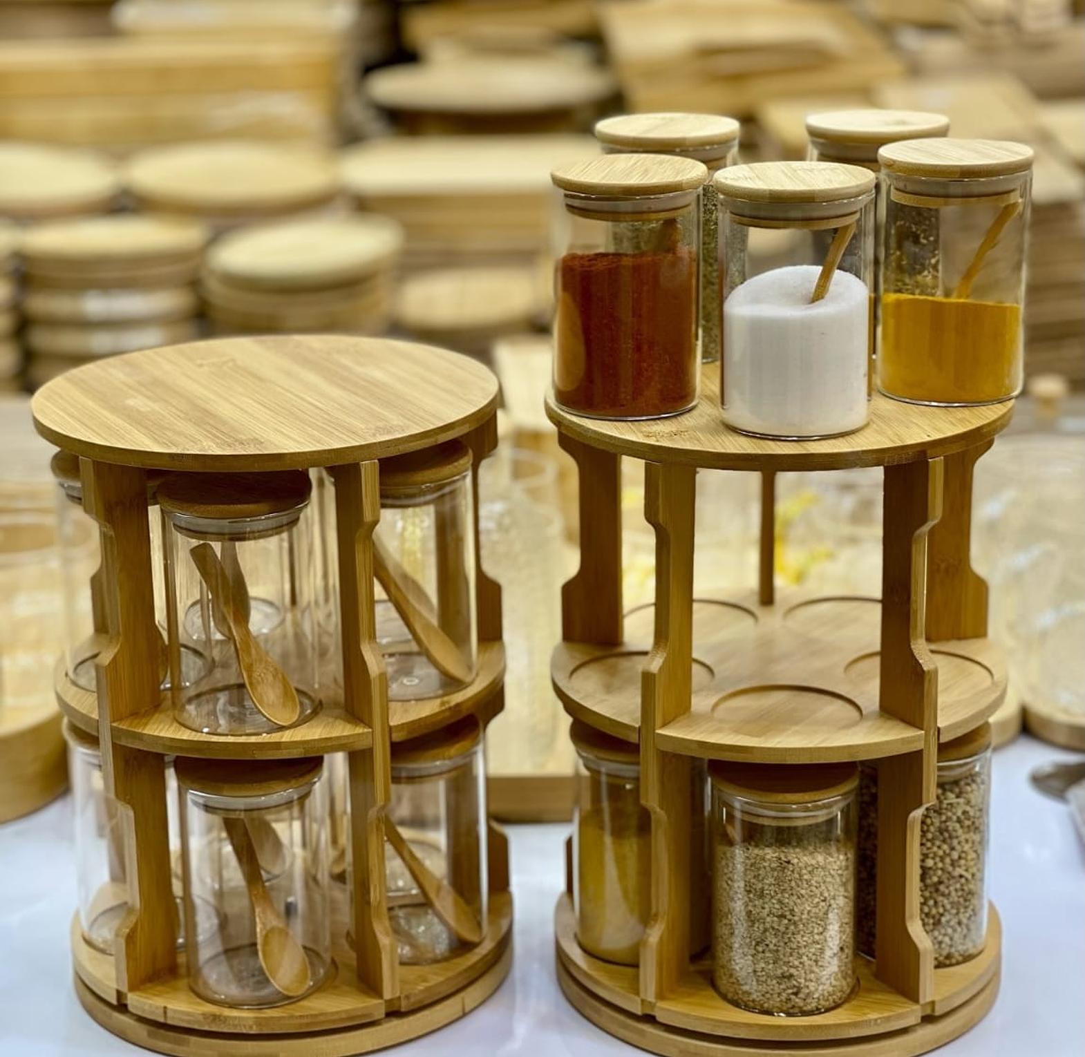 Organize your culinary essentials with this eco-friendly, 360-degree rotating bamboo spice rack, featuring ten high-capacity 300ml glass jars. Designed for maximum accessibility and style, this tabletop organizer comes complete with matching bamboo spoons and a custom labeling kit for a professional kitchen look.