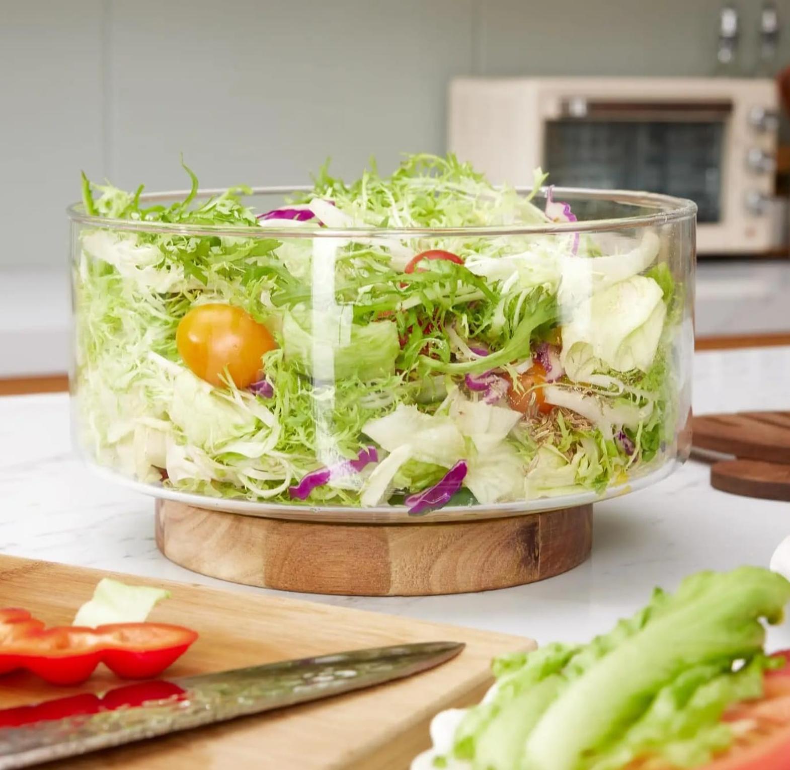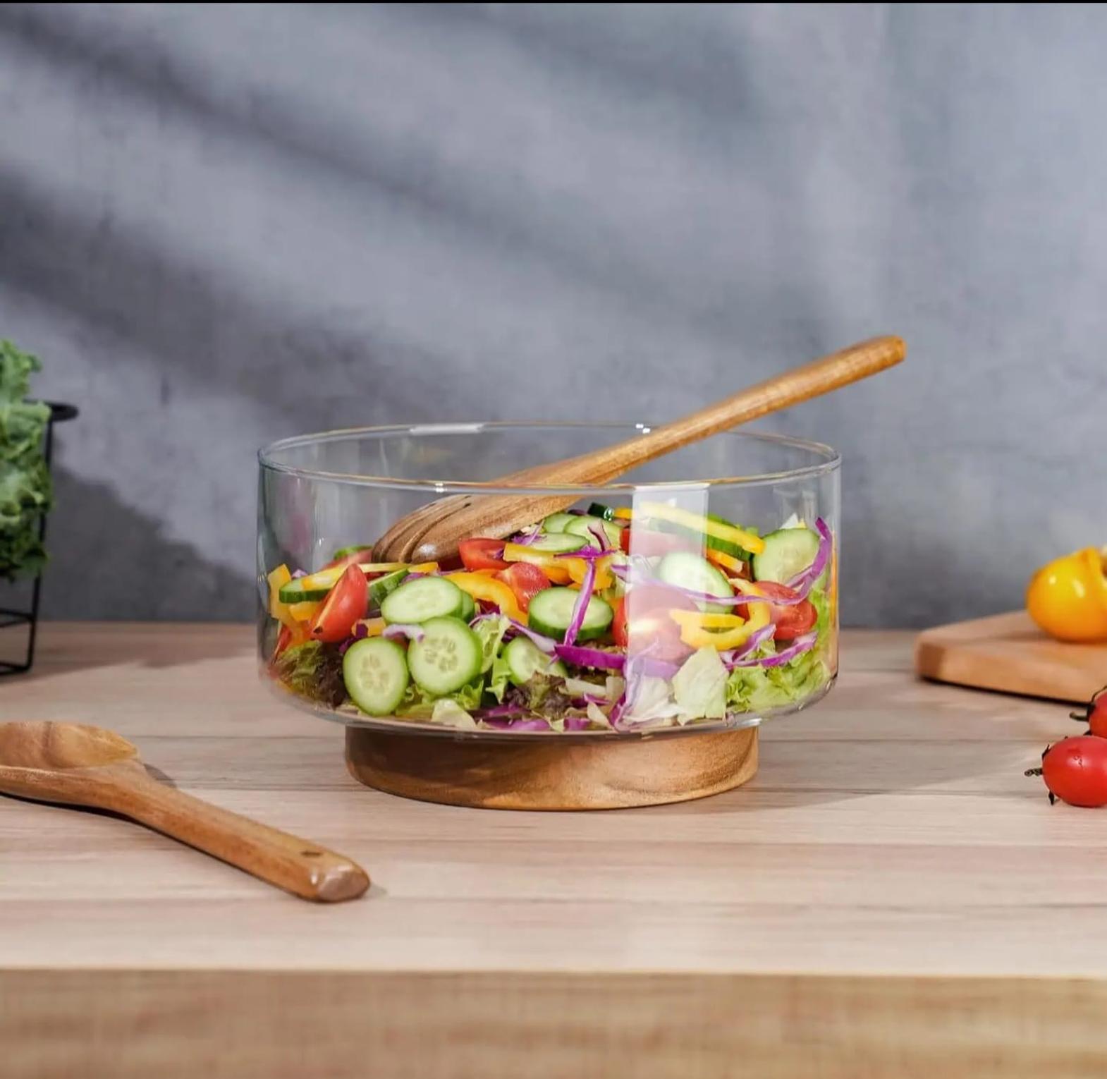 This large, elegant serving bowl features high-clarity glass resting upon a stable, sophisticated acacia wood base. With a generous capacity of approximately 3.7 liters, it is perfect for beautifully presenting salads, fruits, pasta, or snacks at any gathering.