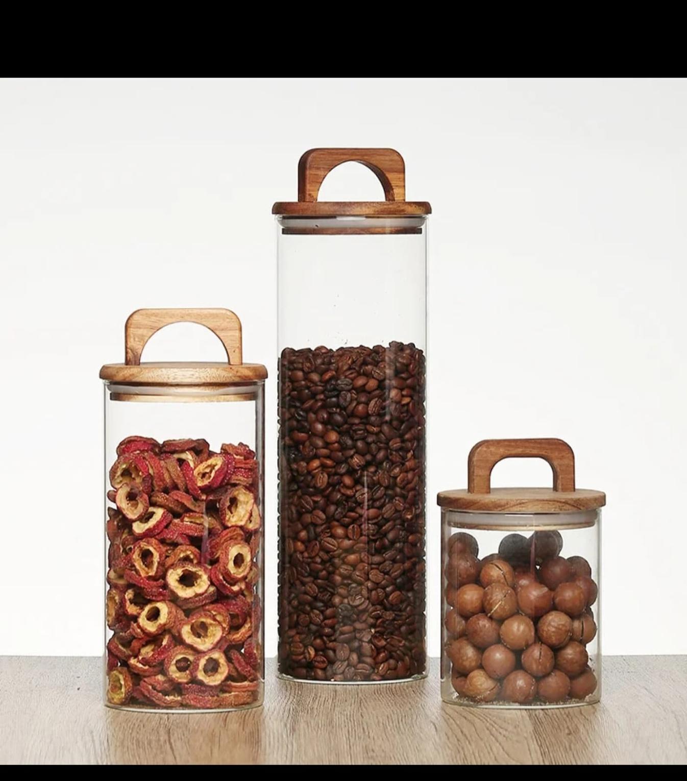 This multi-size set of glass storage jars features a sleek cylindrical design and handsome acacia wood lids with integrated handles for easy access. Ideal for stylish and efficient pantry organization, these containers are perfect for sealing in the freshness of cereals, grains, and dry goods.