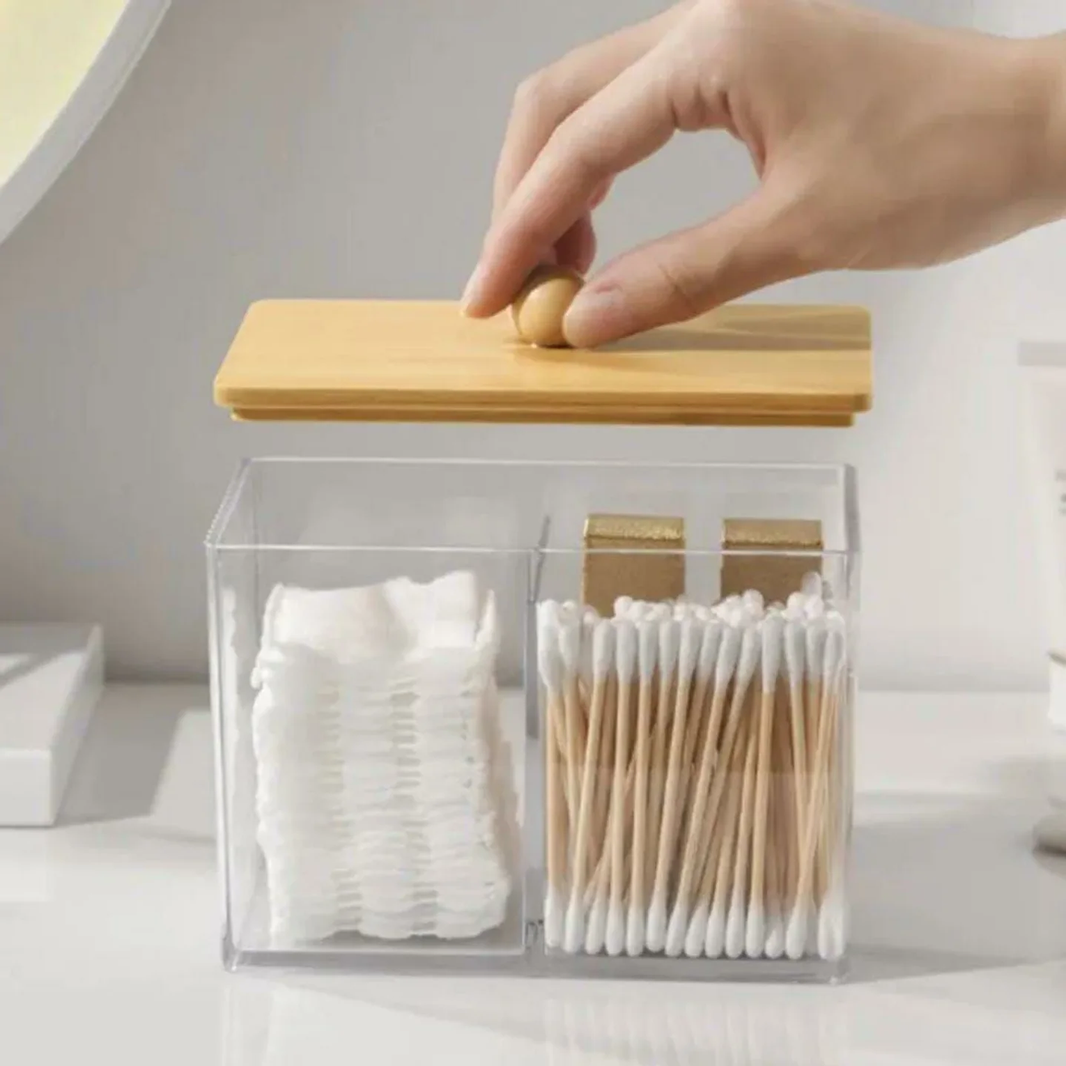 Keep your vanity or bathroom counter clutter-free with this partitioned acrylic organizer. It features a clear, fluted design and a natural bamboo cover for hygienic storage of earbuds, cotton swabs, and cotton pads.