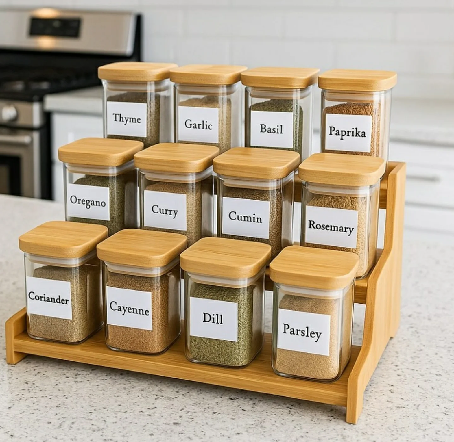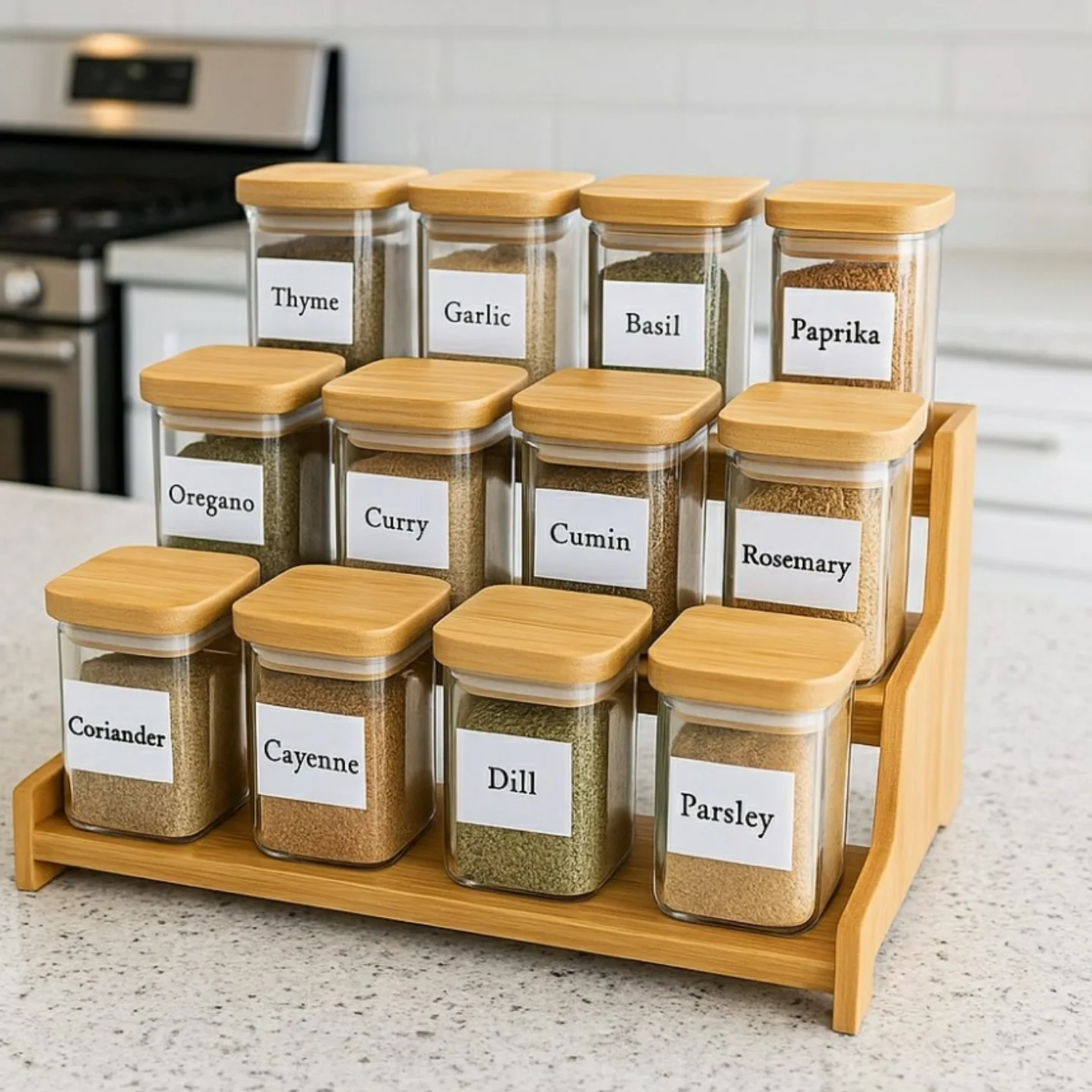 Organize your kitchen with this elegant 12-piece spice set. Featuring clear glass jars with airtight bamboo lids and a matching rack, it keeps your spices fresh and your counter clutter-free.