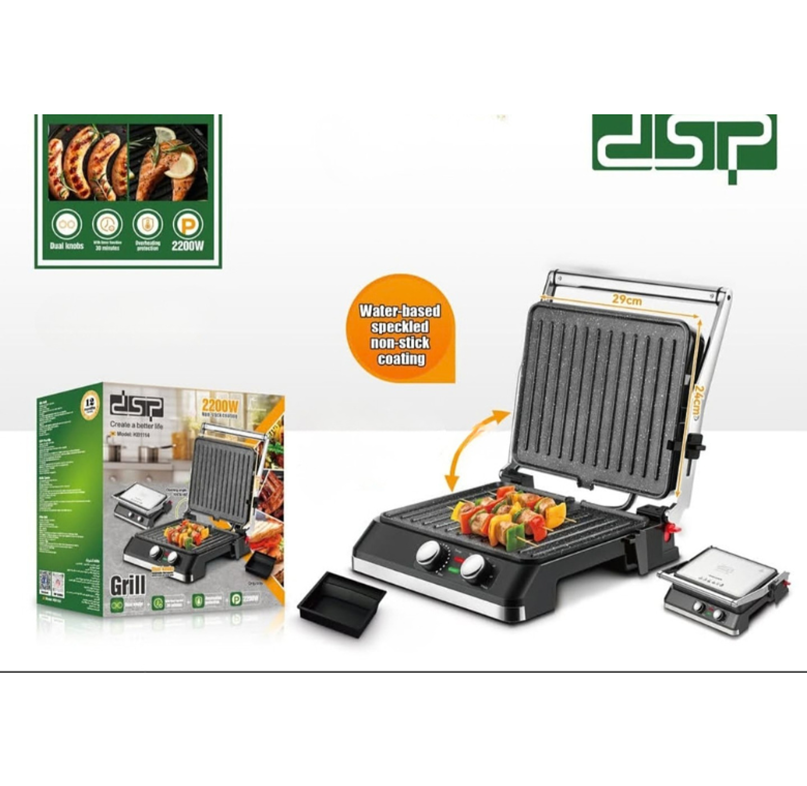 The DSP KB1114 is a robust and stylish culinary tool engineered to bring professional grilling results to your kitchen counter. With its "cold touch" stainless steel accents and advanced safety features, it provides a seamless and efficient cooking experience for a wide range of flavors.