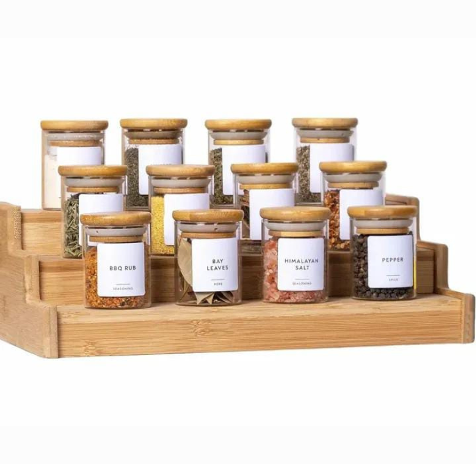 This complete kitchen organization system features twelve round, airtight borosilicate glass spice jars with natural bamboo lids to preserve freshness. The set is neatly displayed on a tiered bamboo stand, providing clear visibility and easy access to all your favorite seasonings.