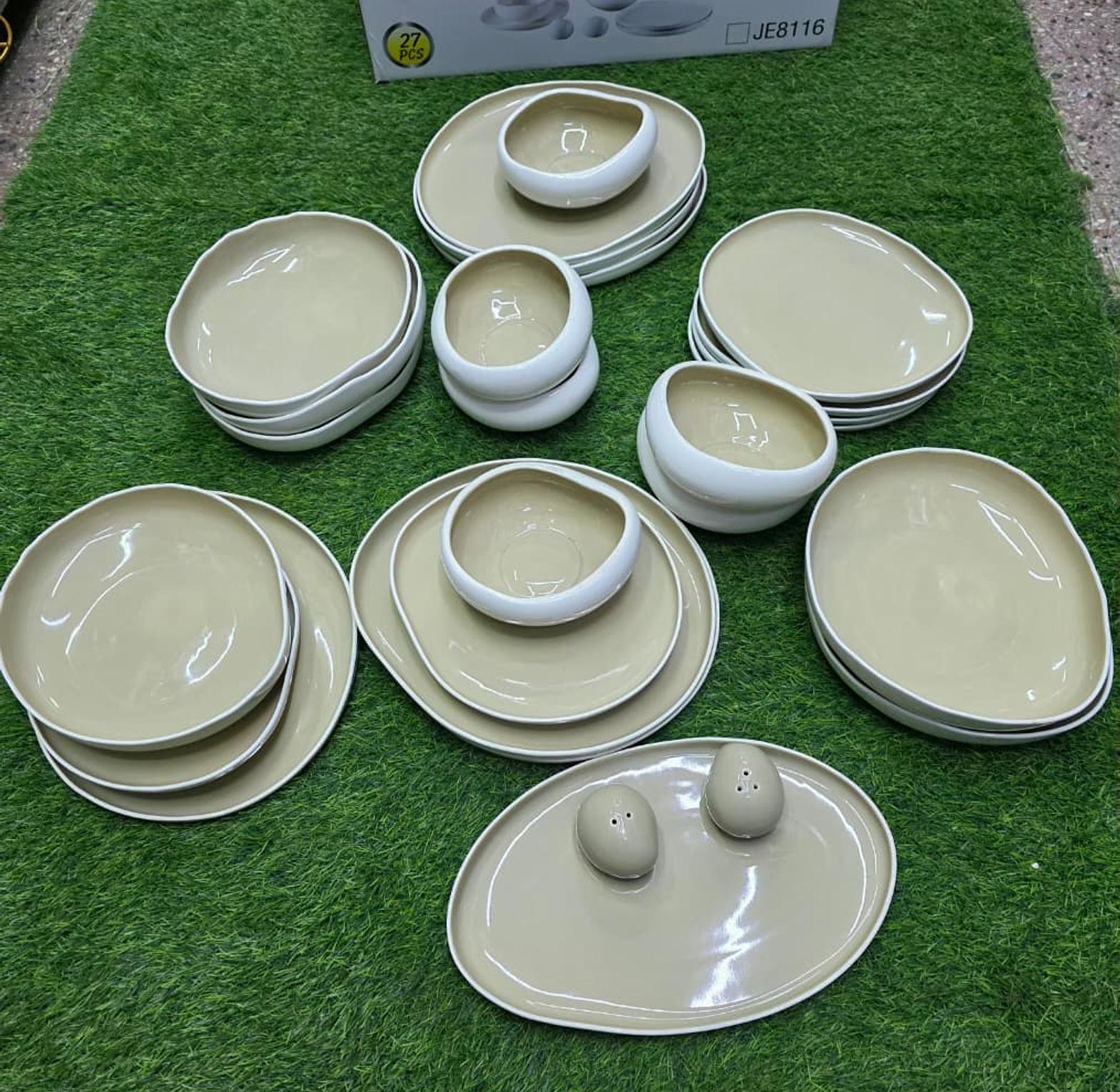This Elegant European Double Glaze Porcelain Dinner Set is designed to bring sophistication and class to every meal, whether it’s a daily dinner or a special gathering. Made from high-quality double-glazed porcelain, each piece offers a smooth, durable finish that resists wear while maintaining its refined shine over time. The 27-piece set provides everything you need for a well-coordinated table, including six dinner plates, six side plates, six salad bowls, six soup bowls, two salt shakers, and a serving platter. Its balanced combination of practicality and elegance makes serving meals effortless while enhancing the overall dining atmosphere. The clean European-inspired design fits seamlessly into both modern and traditional settings, giving your table a polished and organized look. Built for durability and everyday convenience, this set is easy to clean and suitable for regular use. With its complete assortment and timeless appeal, it’s a reliable choice for anyone who values both function and presentation in their kitchen.