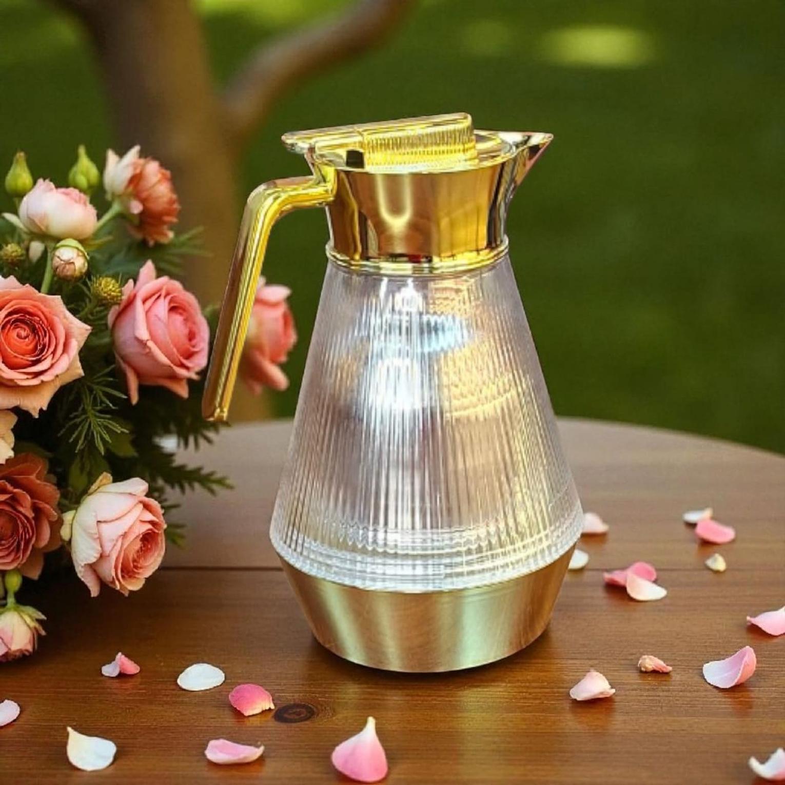 An eye-catching and functional Vaccum Flask with a generous Capacity: 1ltr. This carafe features an elegant crystal-ridged body and a gold top/handle, perfect for stylishly keeping beverages hot or cold for hours.