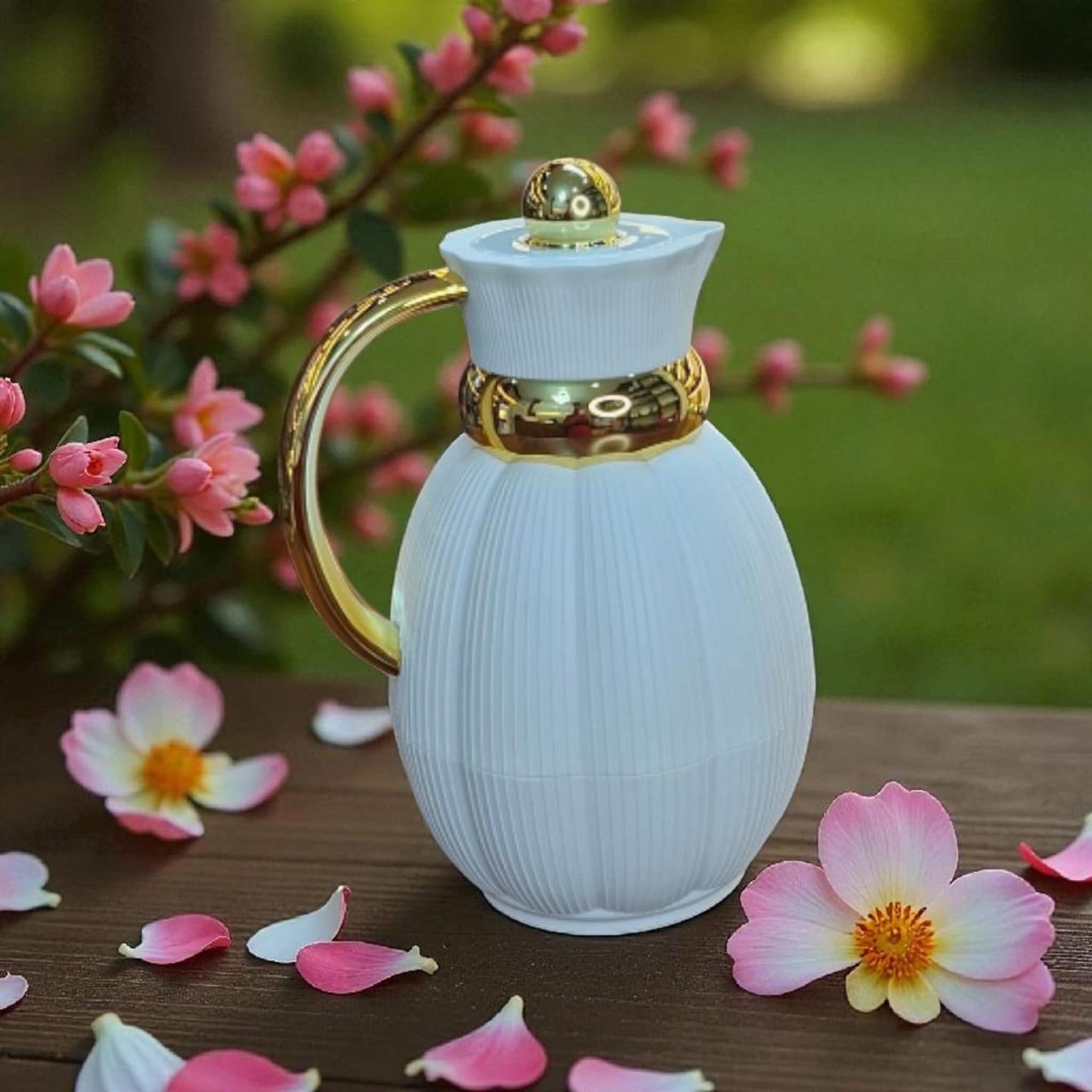 An exceptionally Elegant Vaccum Flask with a generous Capacity: 1ltr. This carafe features a stylish ribbed white body and striking gold accents, ensuring your beverages stay hot or cold for hours.