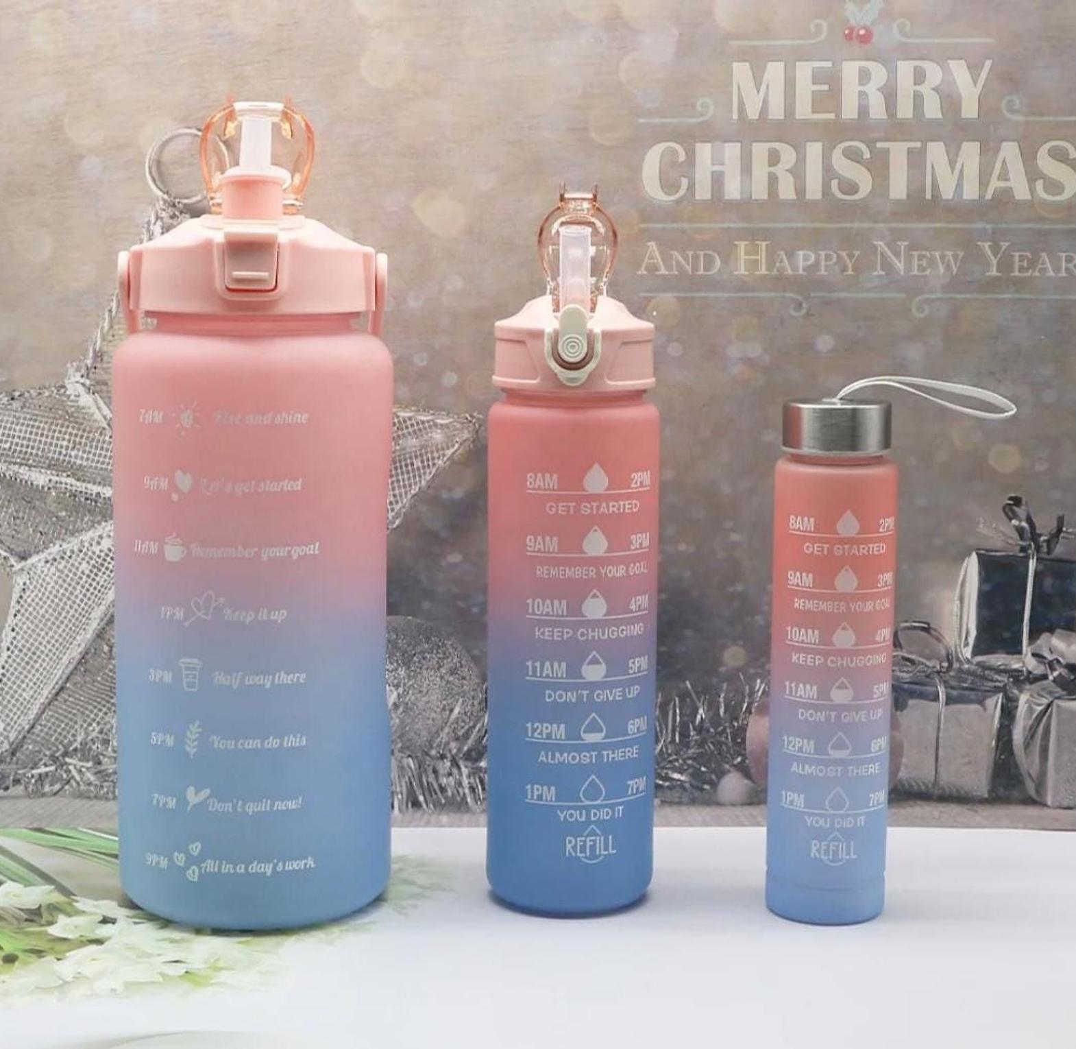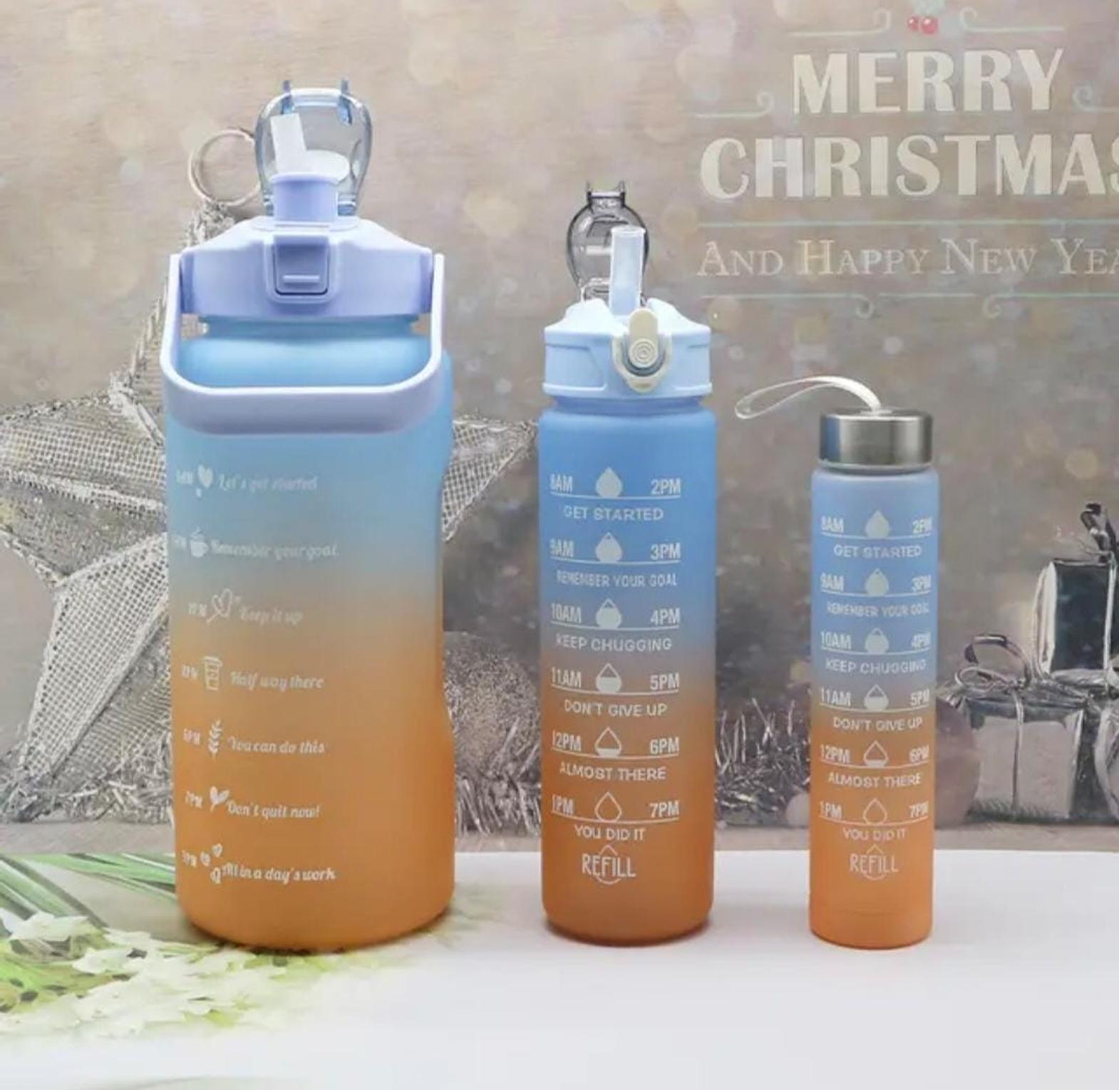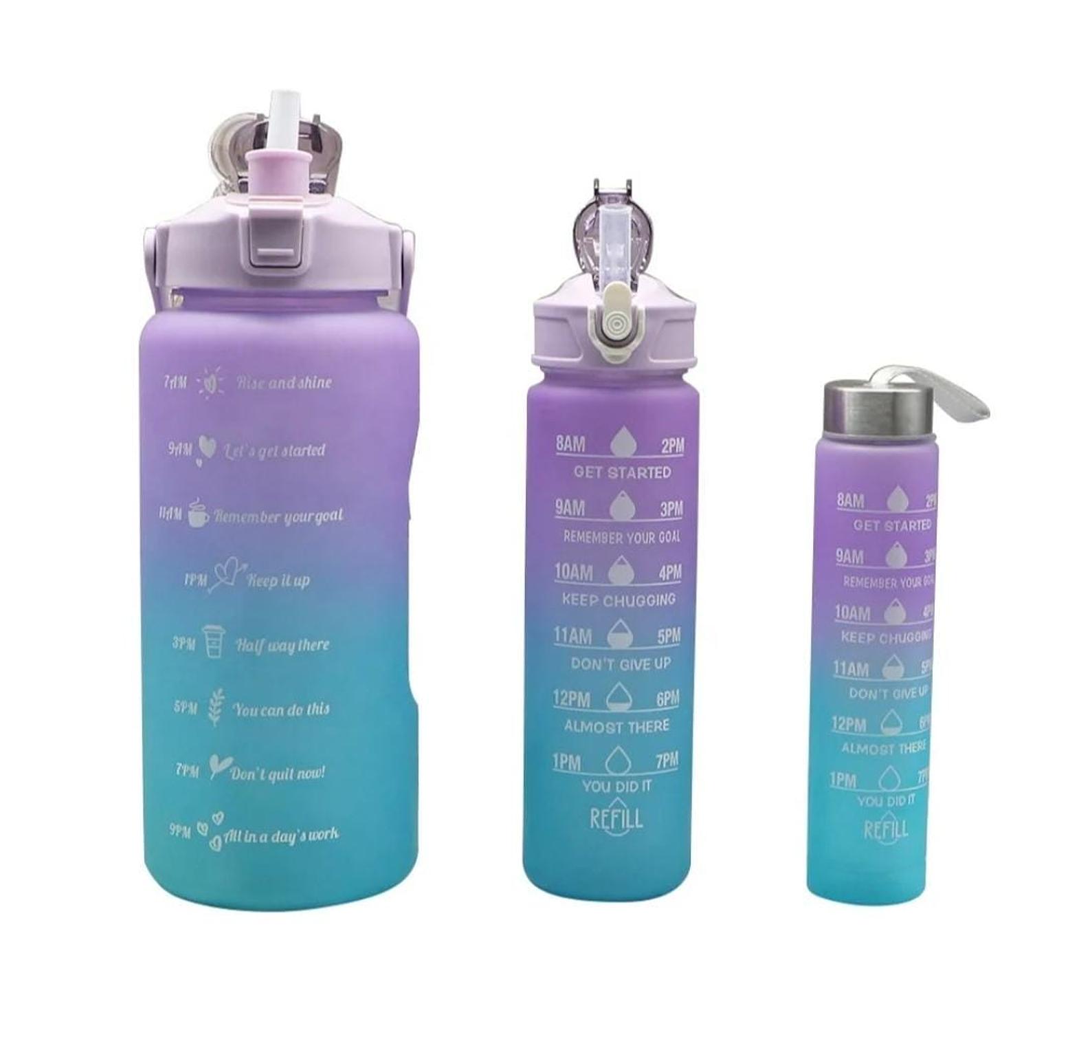 This complete 3-piece water bottle collection features encouraging time markers to boost your daily fluid intake, designed with a secure, leakproof flip-top lid. Made from non-toxic, BPA-free plastic, this set ensures healthy hydration whether you're at home or on the go.