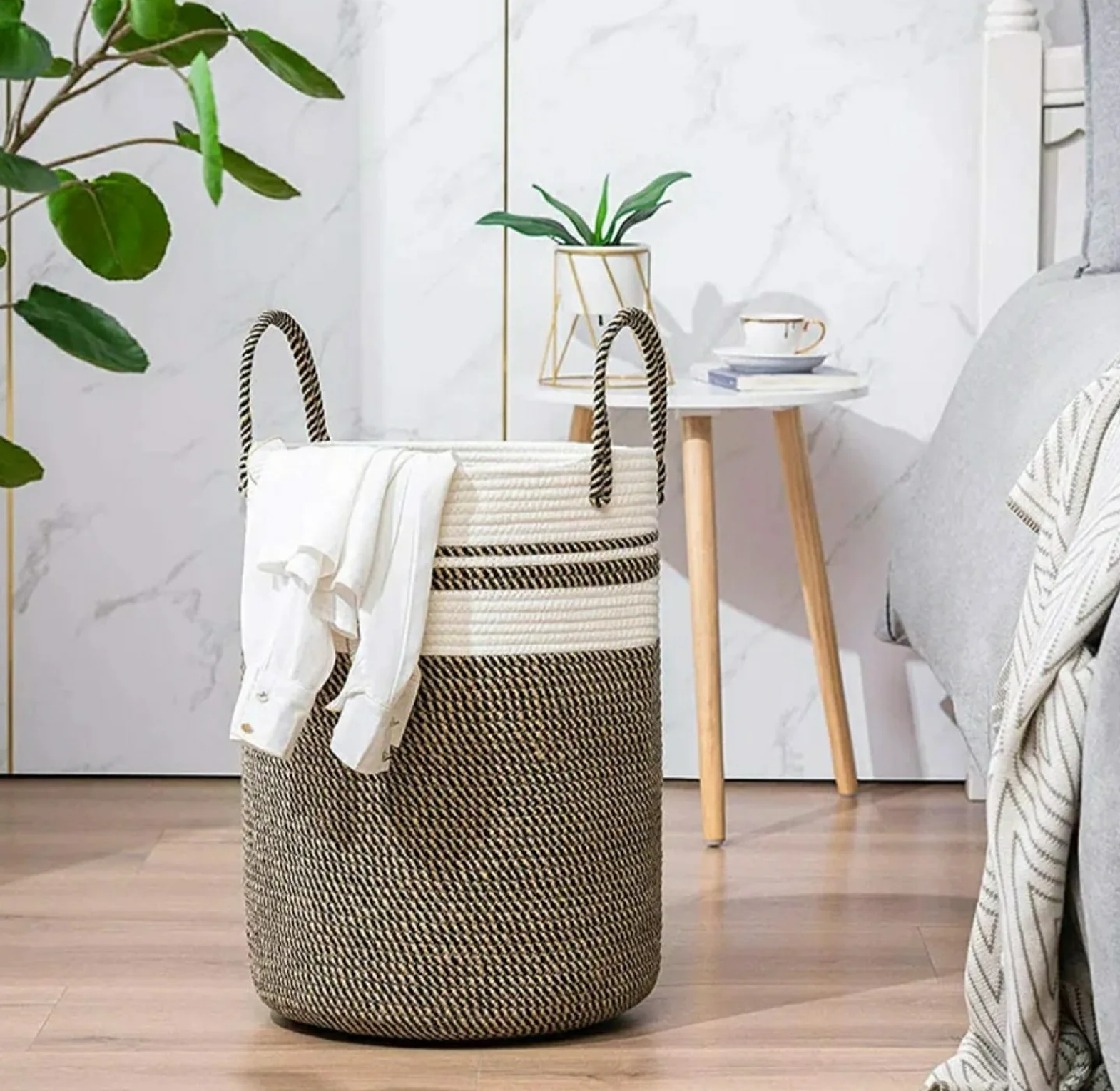 A stylish, foldable, and durable Cotton Rope Hand-woven large storage Basket with Handles. This multi-purpose basket is perfect for use as a foldable laundry Basket / Toys Storage / Blankets and Households use.