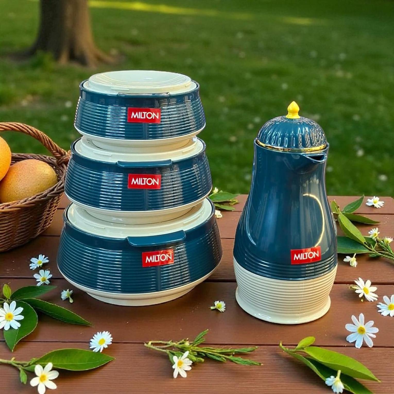 The Milton Venice 4pcs Combo Hotpot set features an elegant, ribbed design. This comprehensive set includes three insulated hotpots (1Ltr, 1.5Ltr, 2.5 Ltr) and a 1Ltr Vaccum Flask, perfect for keeping meals hot or cold for hours.