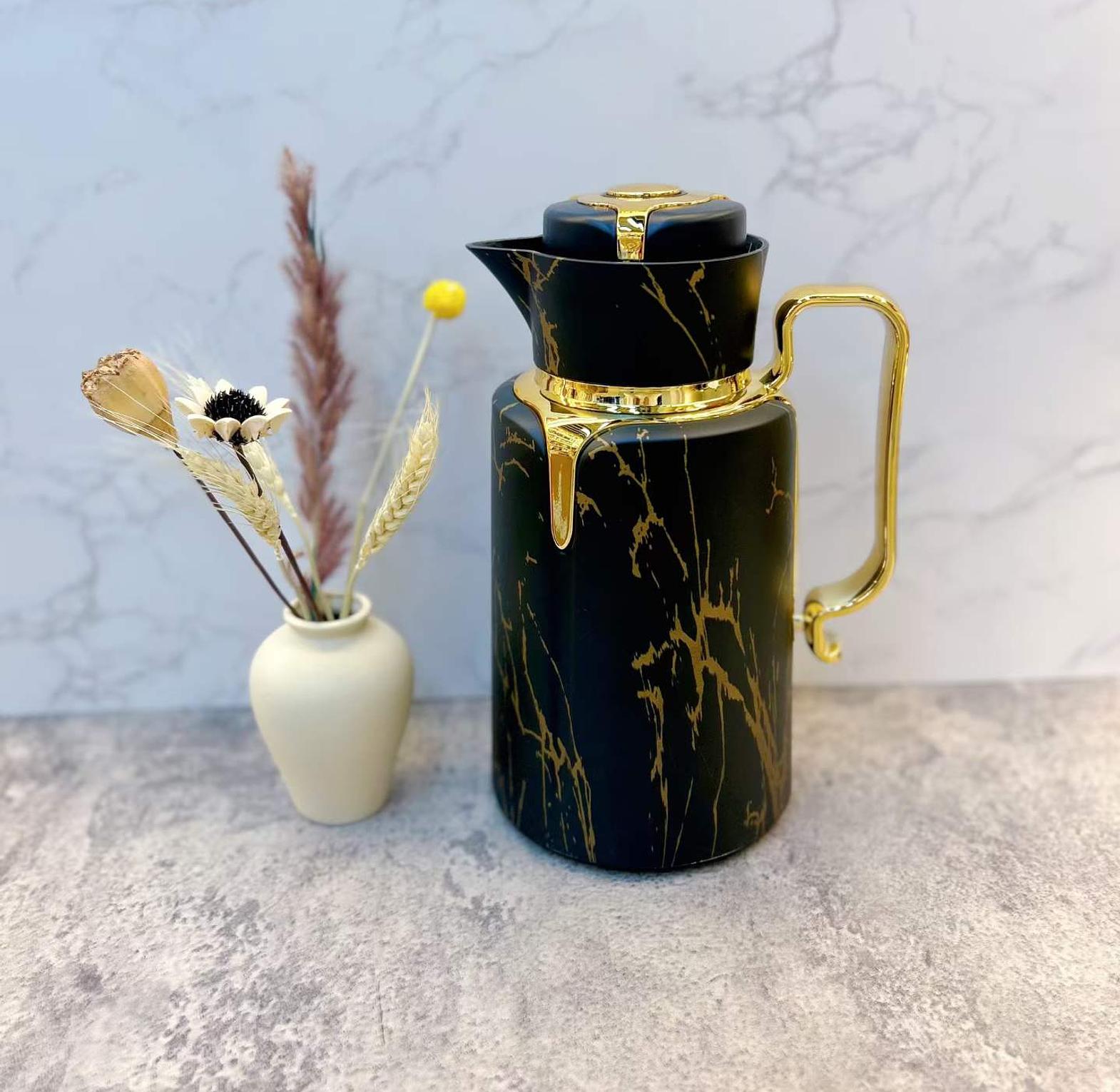 This elegant 1.0-liter vacuum flask boasts a sophisticated black and gold marbled exterior, providing a touch of luxury to your beverage service. Made from food-grade material with guaranteed quality, it effectively keeps your drinks hot for extended periods.