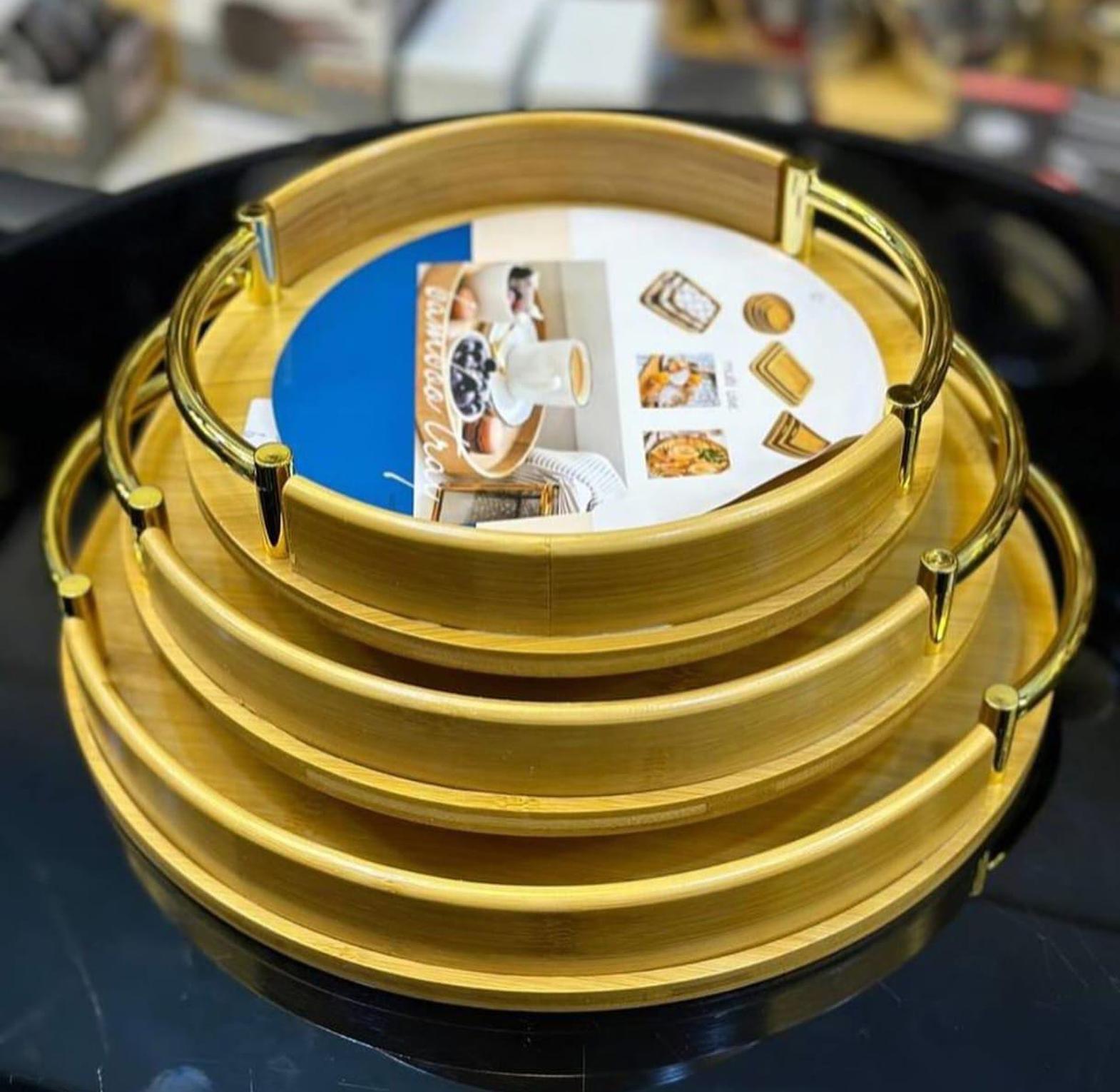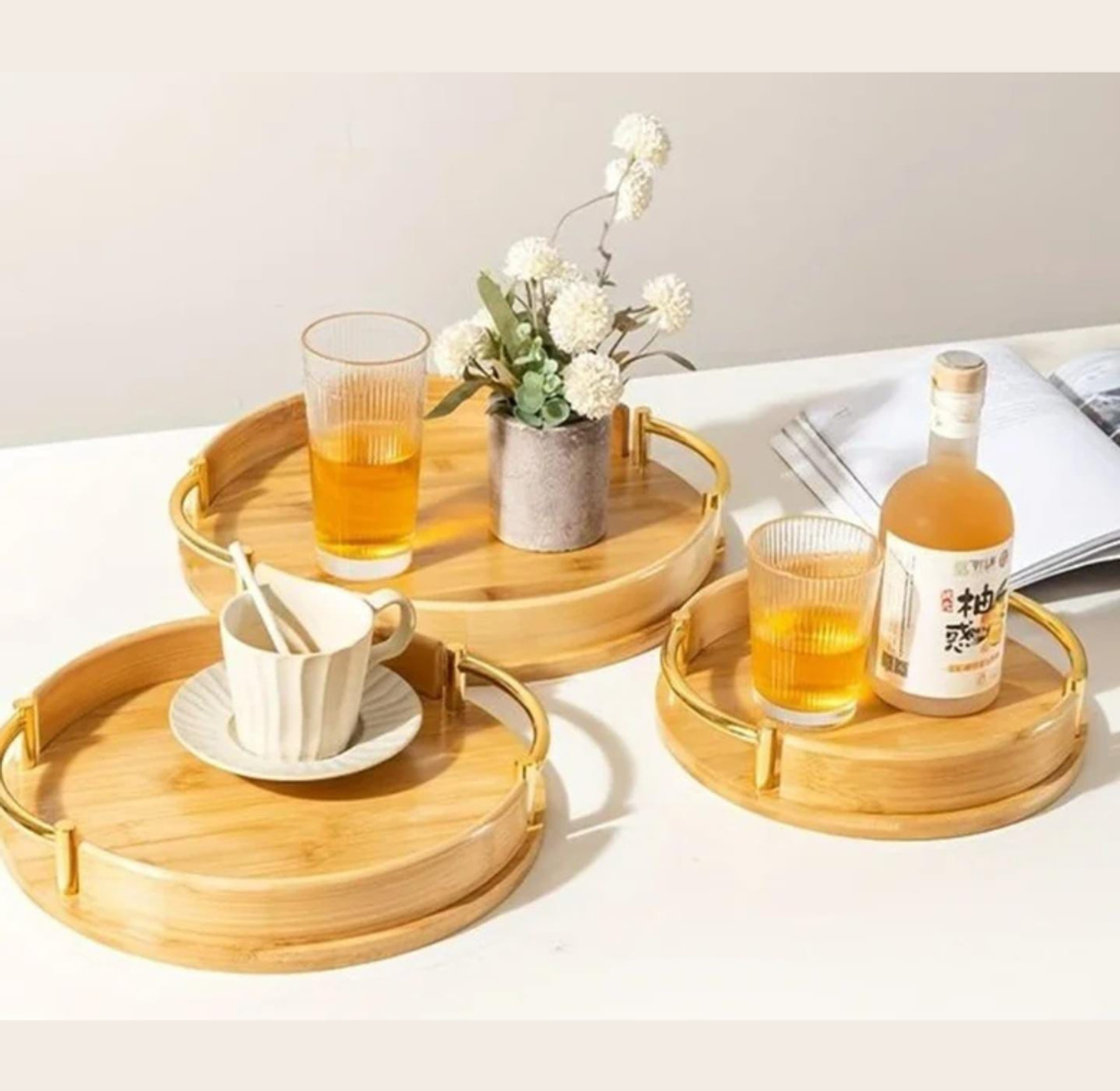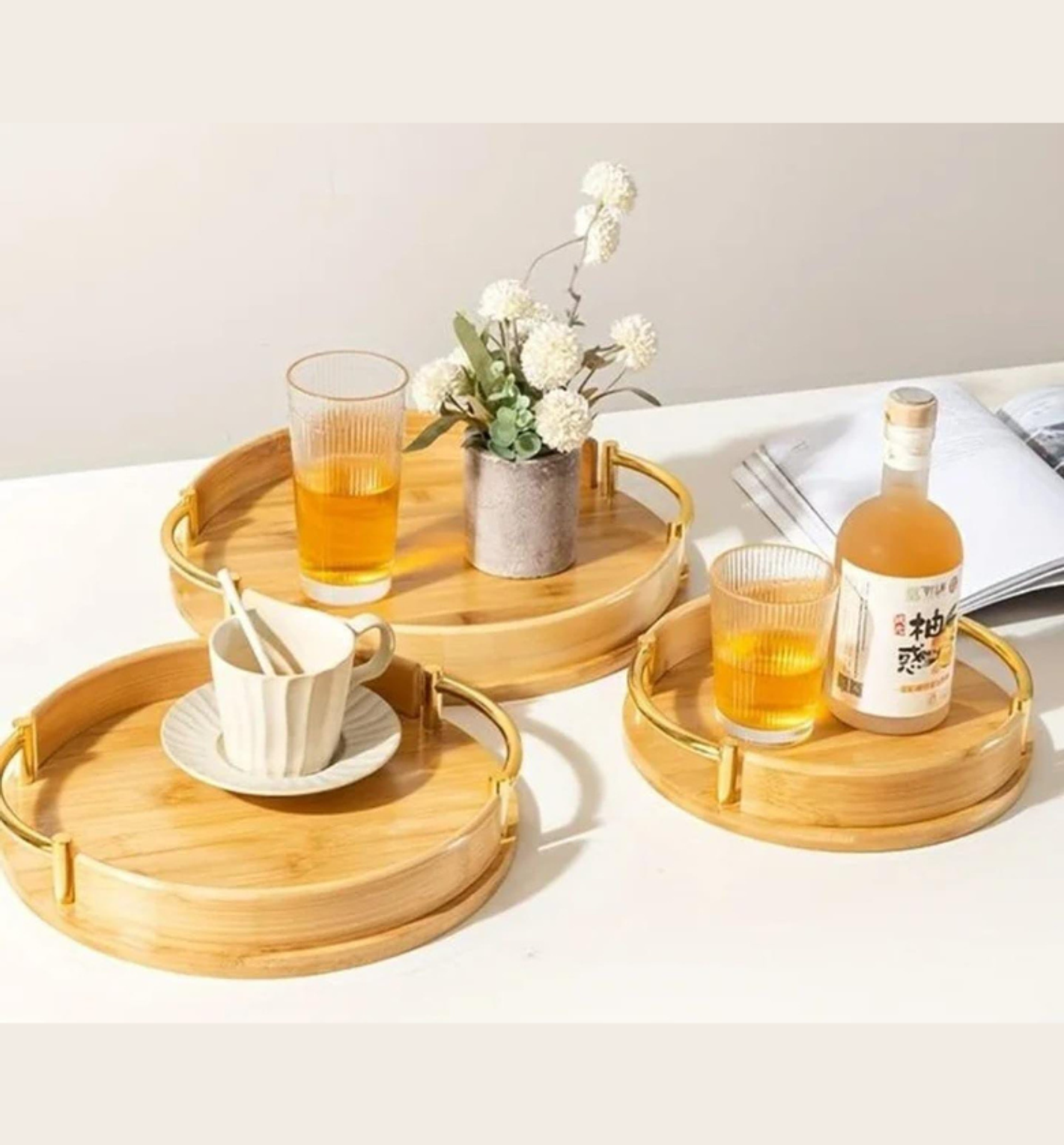 Serve anything from morning coffee to appetizers with distinguished style using this nested set of multi-functional bamboo trays. Finished with sleek gilded metal handles, these trays combine natural elegance with sturdy, reliable portability.