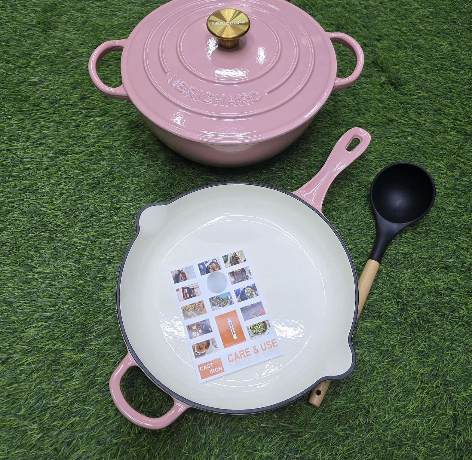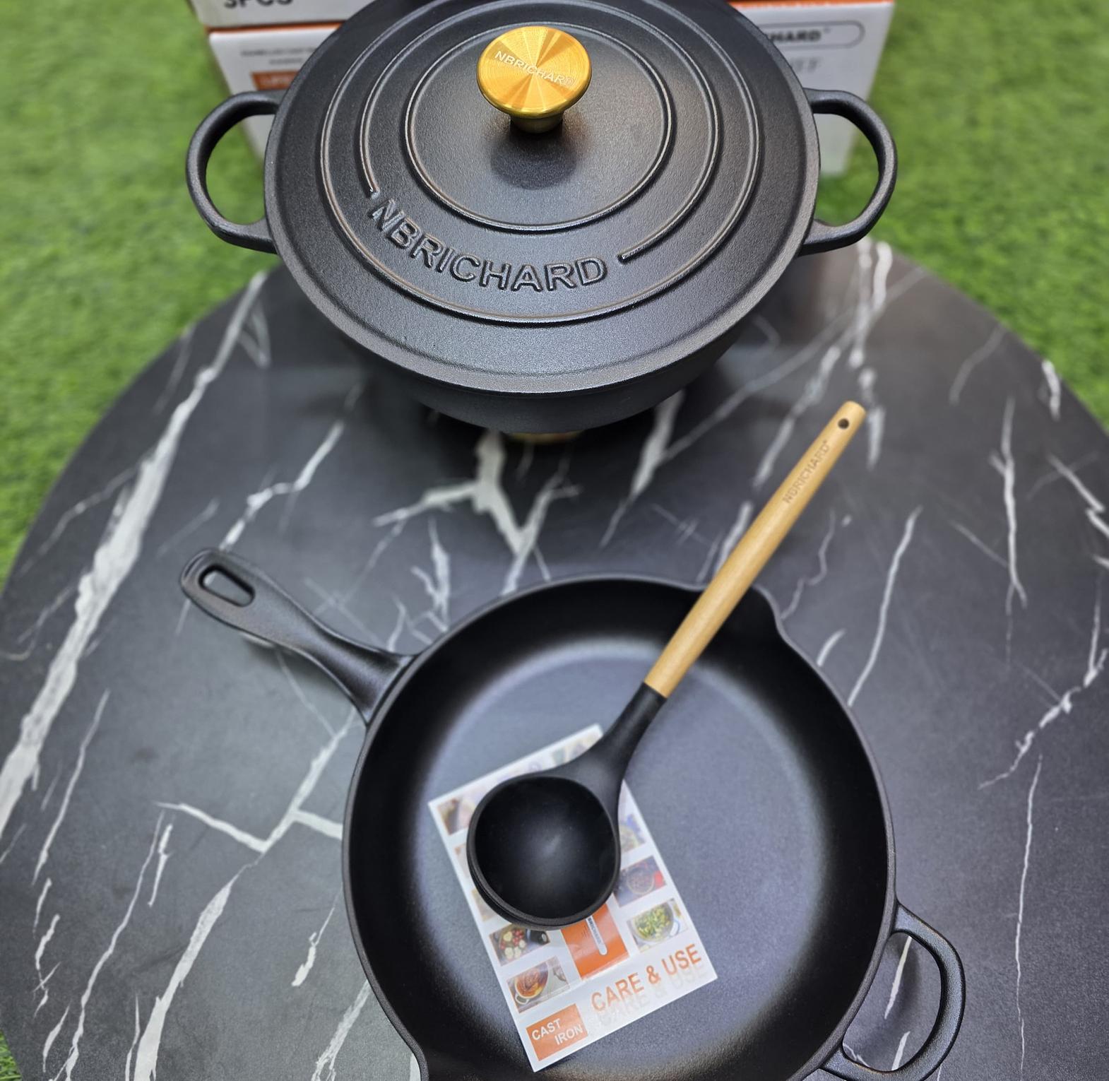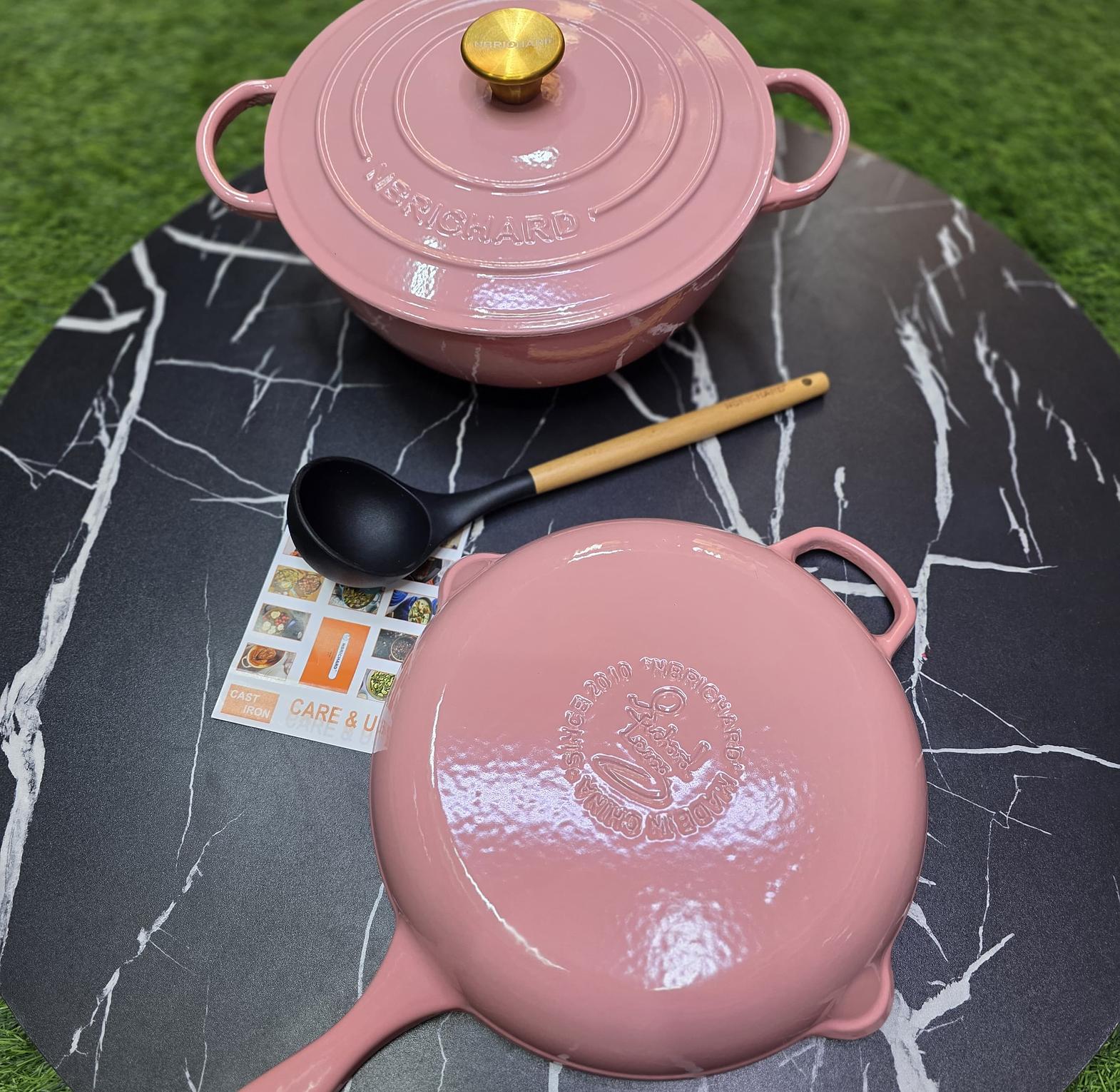 Elevate your kitchen with this heavy-duty 3-piece enamel cast iron set, featuring a 4.5L soup casserole and a 2.6L skillet. Designed for durability and high performance, this set includes premium gold knobs and a heat-resistant silicone spoon, making it perfect for cooking, baking, and direct table service.