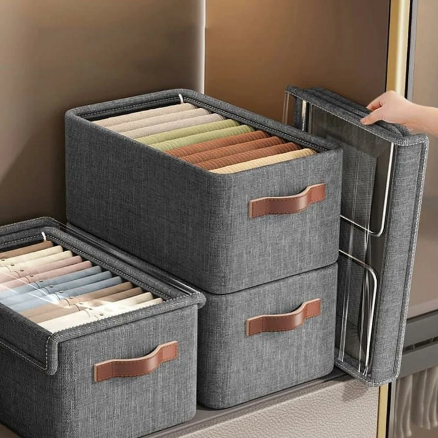 Declutter your wardrobe with style using this durable, grey hard-fabric storage bin featuring elegant leather-style handles. Its collapsible design includes a convenient clear top window, allowing you to instantly identify contents while protecting your items from dust.