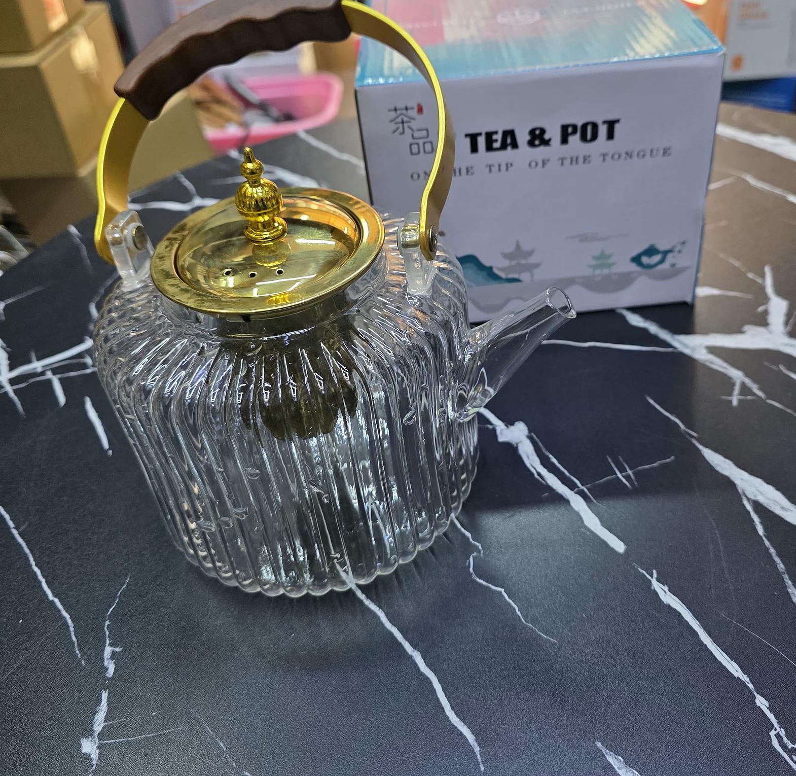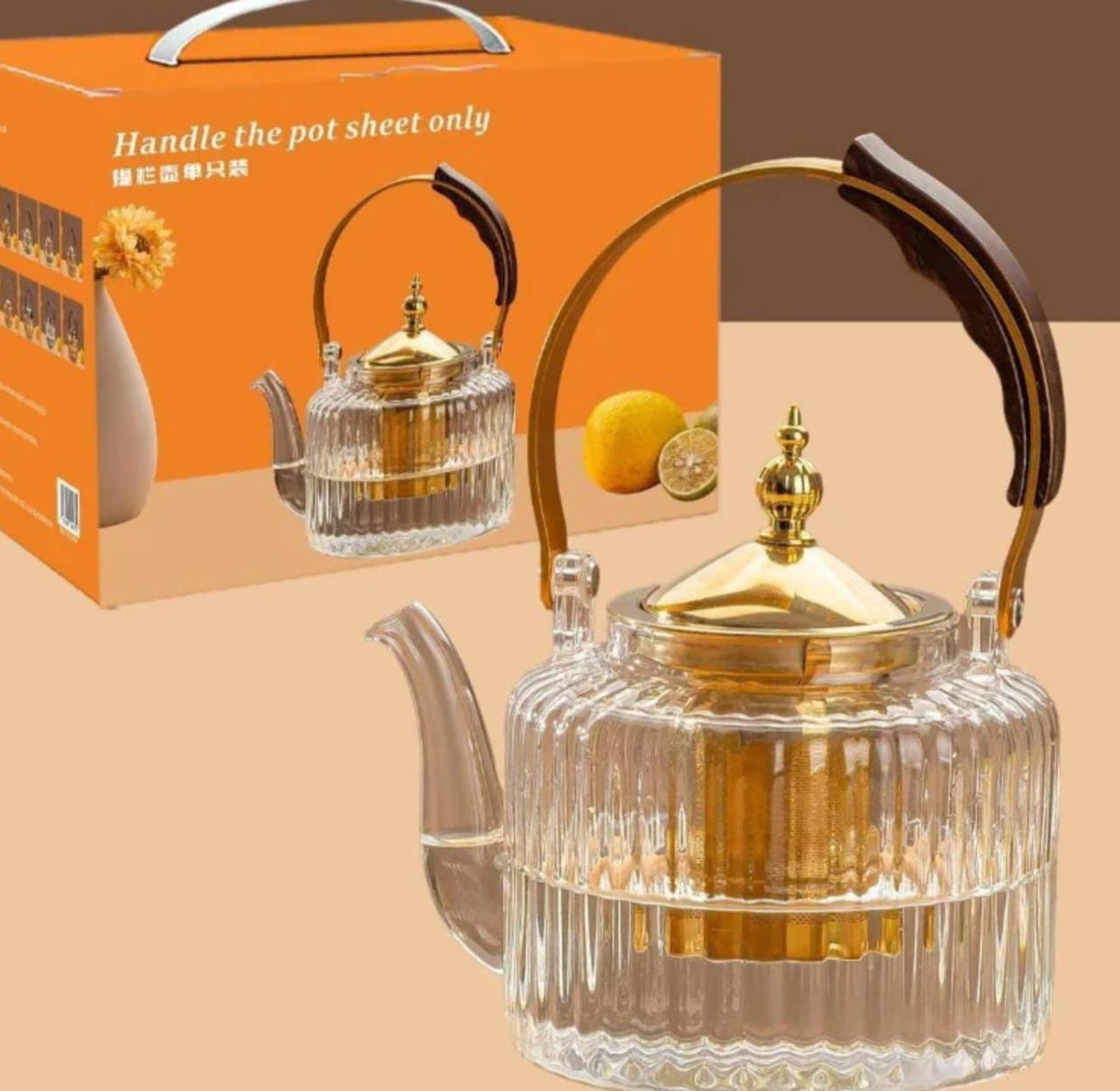 This elegant teapot is crafted from high borosilicate, heat-resistant glass with a sophisticated diamond-ribbed exterior. It comes complete with a decorative gold-tone lid, an integrated fine mesh strainer, and a comfortable wooden-accented metal handle.