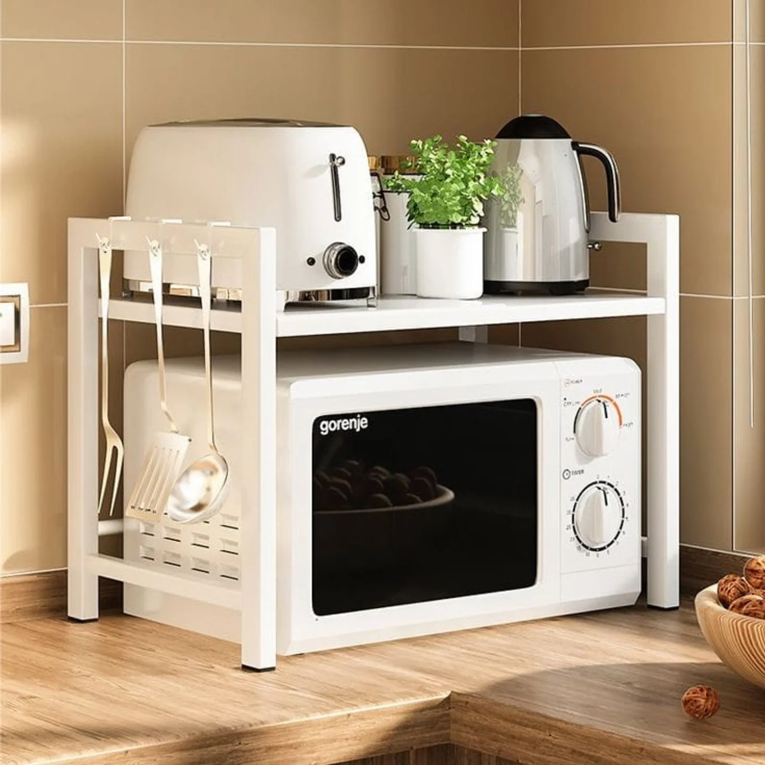 A versatile High Quality Single Layer expandable microwave stand. This SPACE-SAVER keeps items organized vertically, leaving you more counter space, and is Easy to assemble and install.