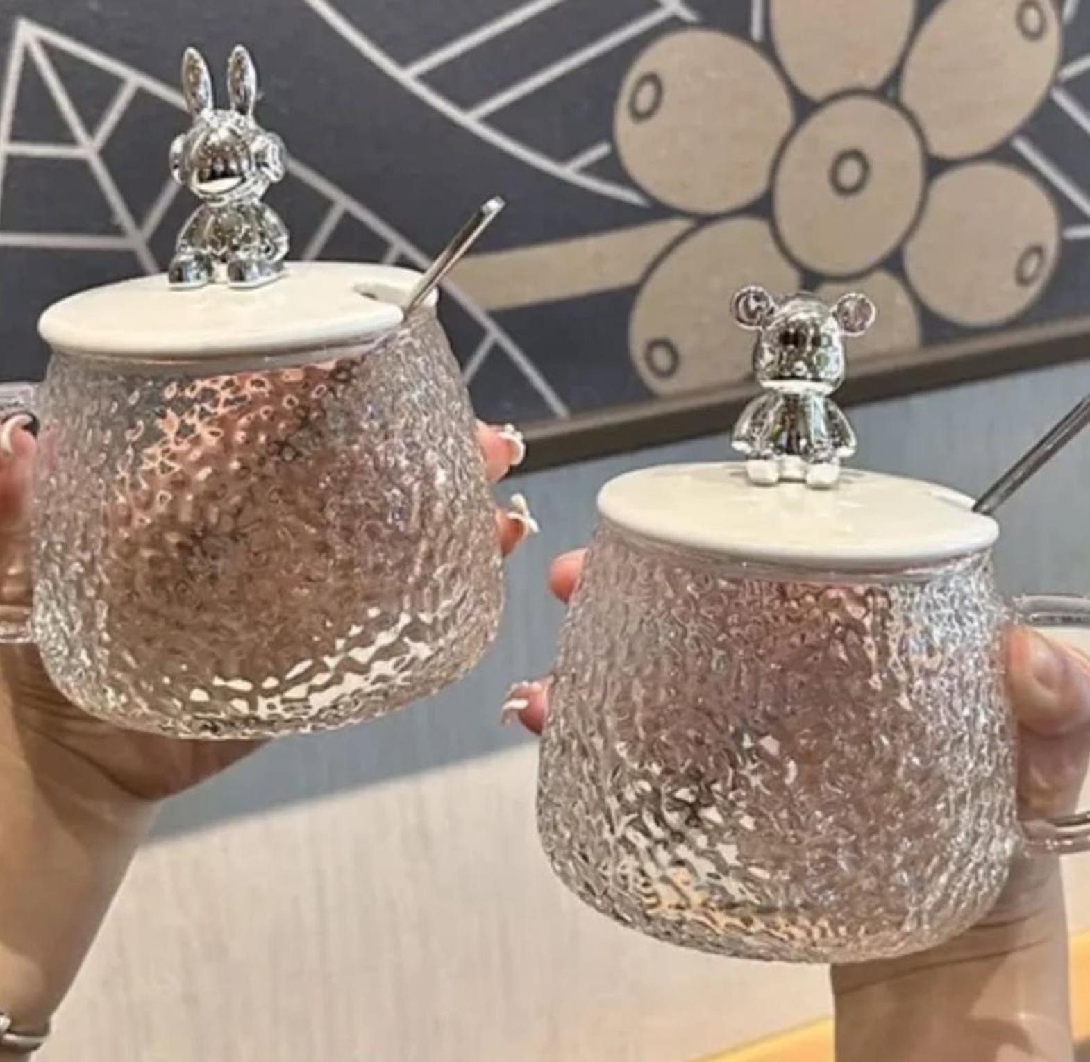 Enjoy your favorite drinks with this charming 300ml mug, featuring a textured hammered glass exterior for a unique sparkle and feel. Each set includes a protective lid adorned with a delightful metallic animal character and a matching stirring spoon for convenience.