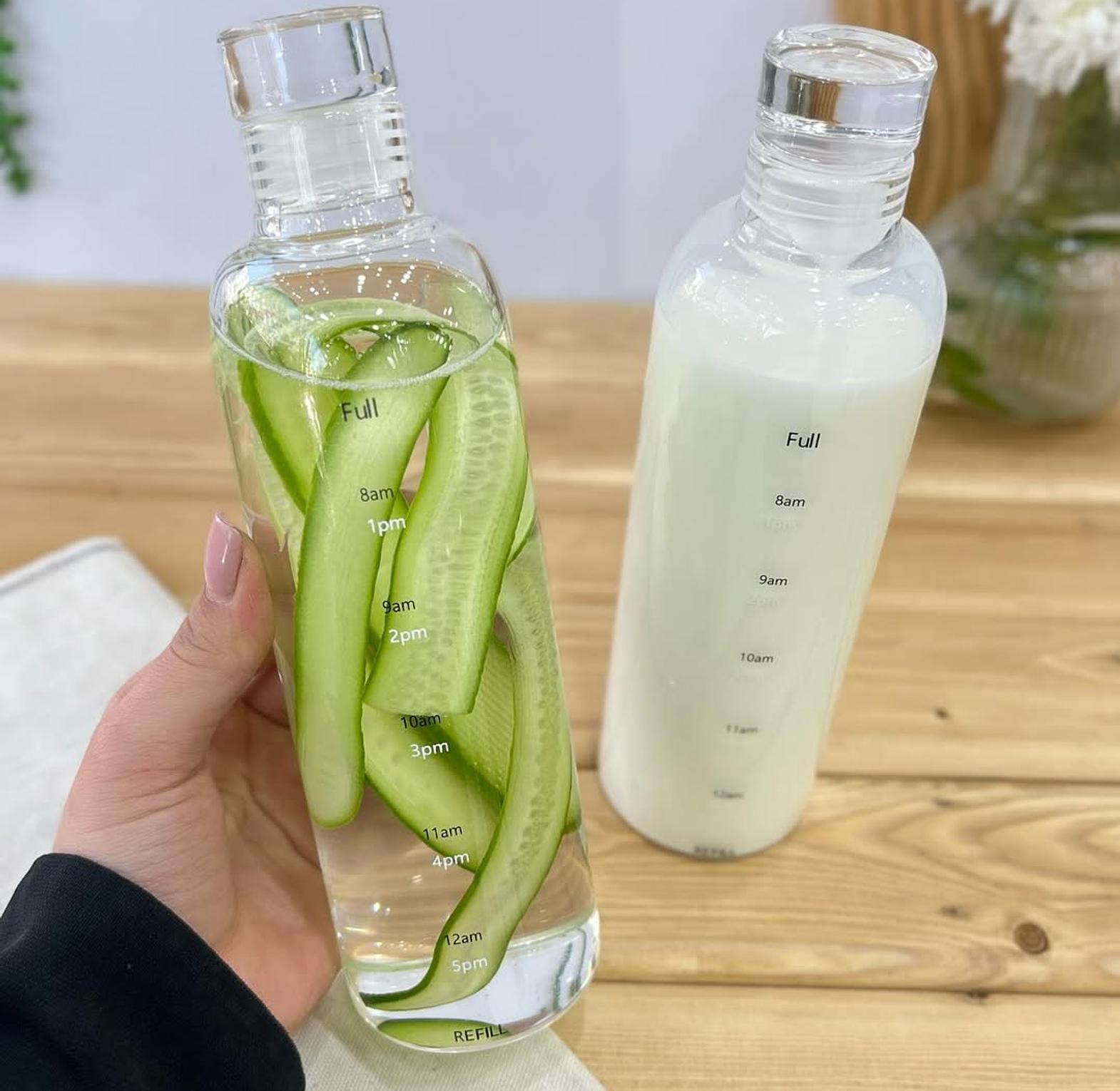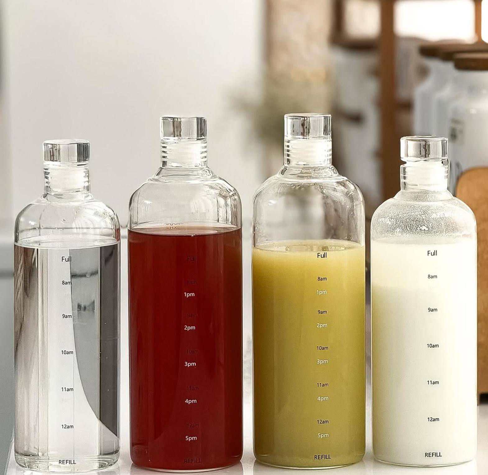 This set of modern glassware features two sizes (550ml and 750ml) of high-quality borosilicate glass storage bottles, complete with helpful time-scale markers. Each bottle includes an airtight lid, making them perfect for preparing and storing juices, infused water, or milk.