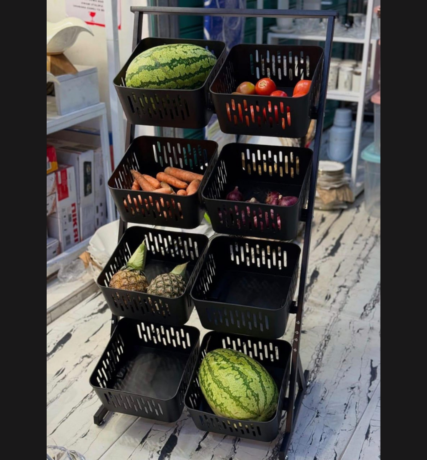 Organize your kitchen with this heavy-duty 4-tier steel storage rack, featuring a double-column design for maximum capacity. Built with movable and lockable wheels, it provides a stable and versatile solution for storing fresh produce and household essentials.