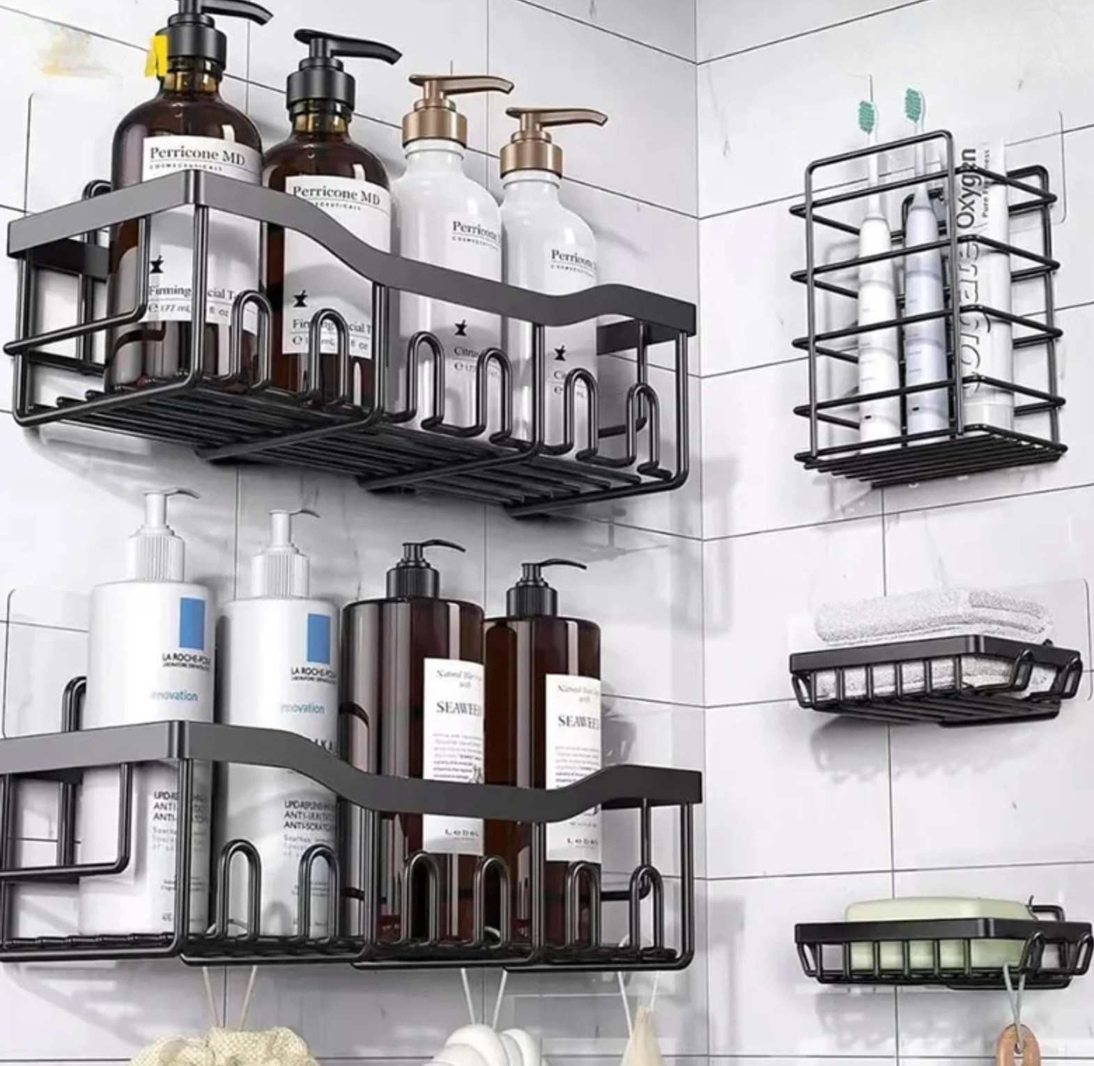 Maximize bathroom storage with this 5pcs set Shower caddy shelf/Bathroom organizer. It is completely rustproof and requires no drilling, utilizing incresed load capacity adhesives for secure installation on smooth surfaces.