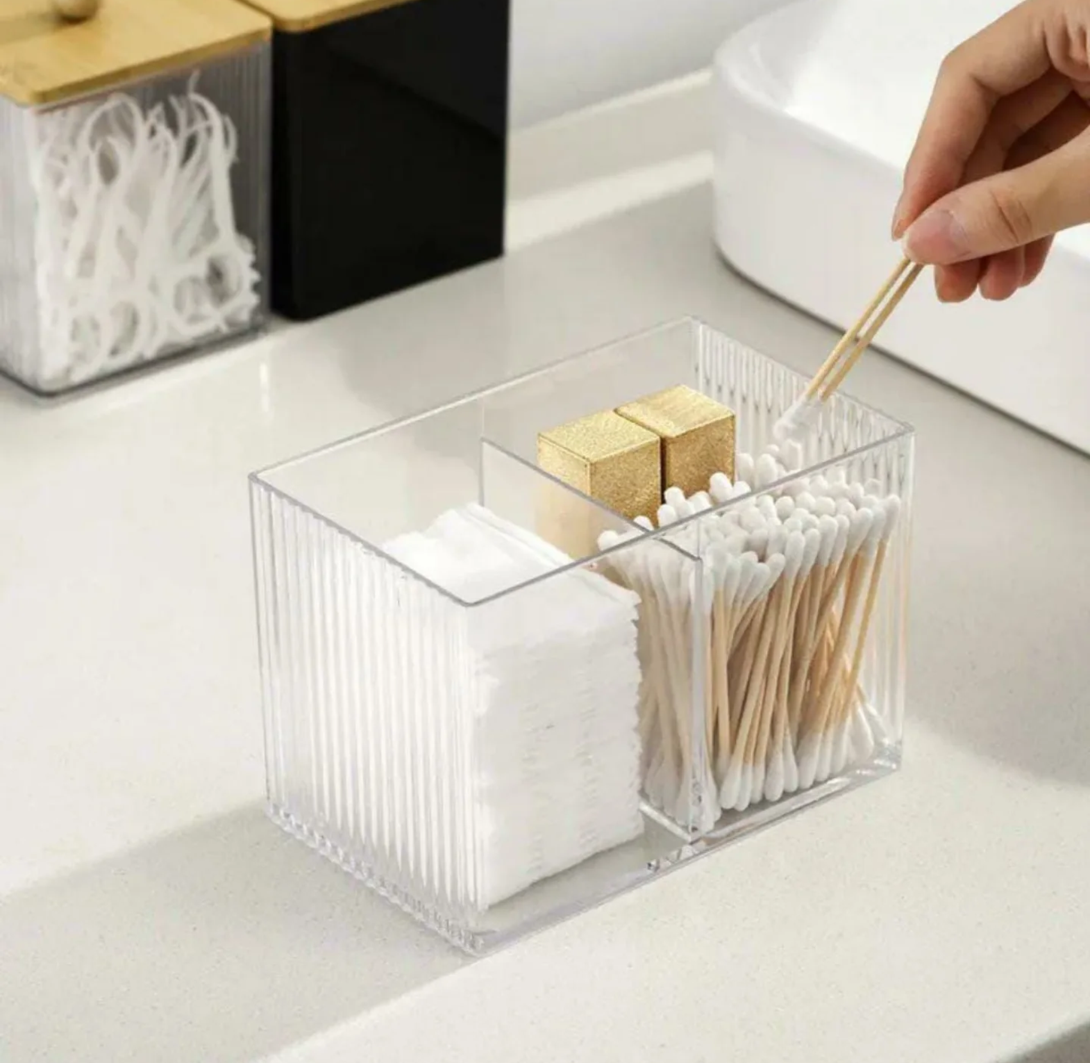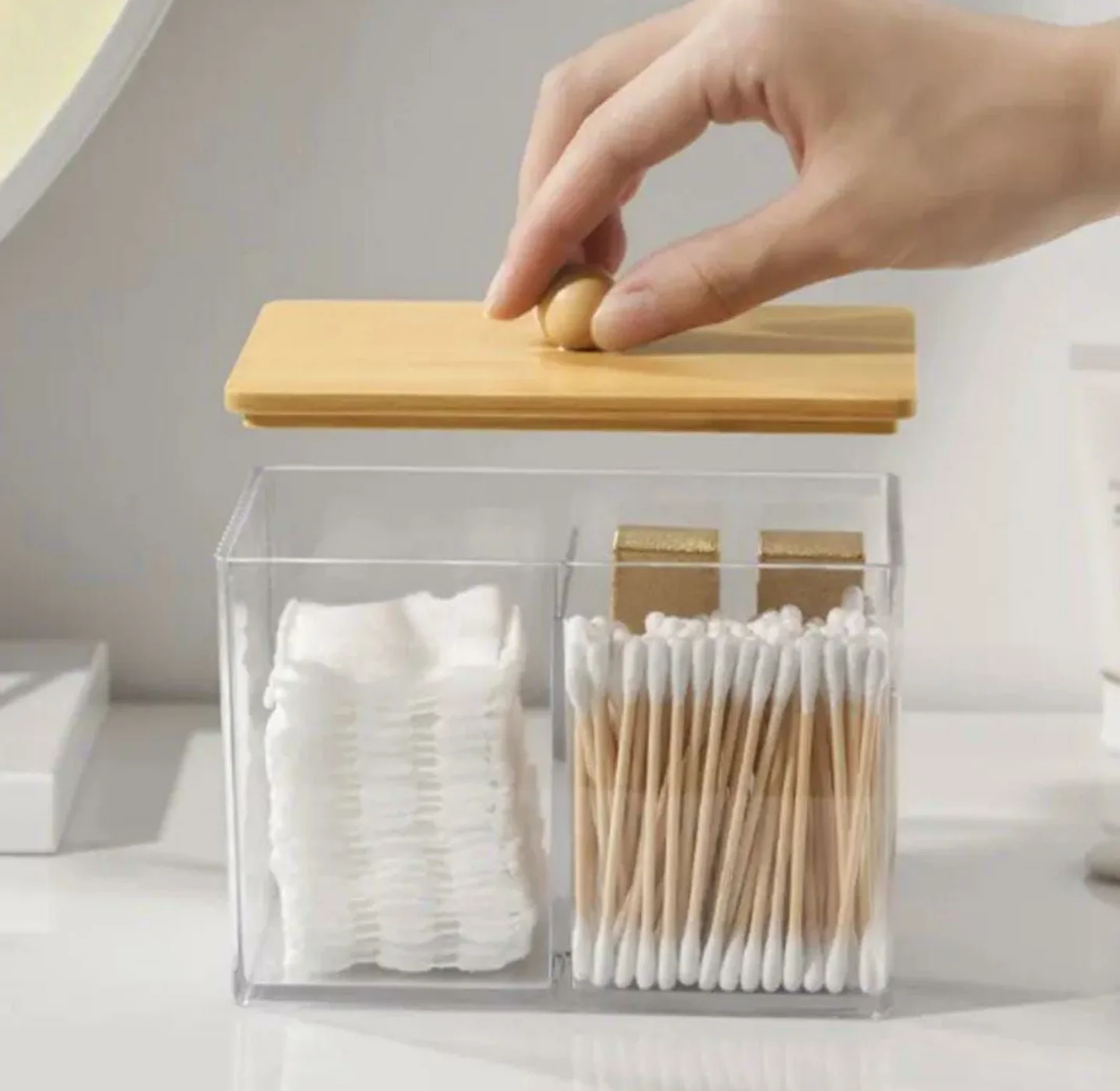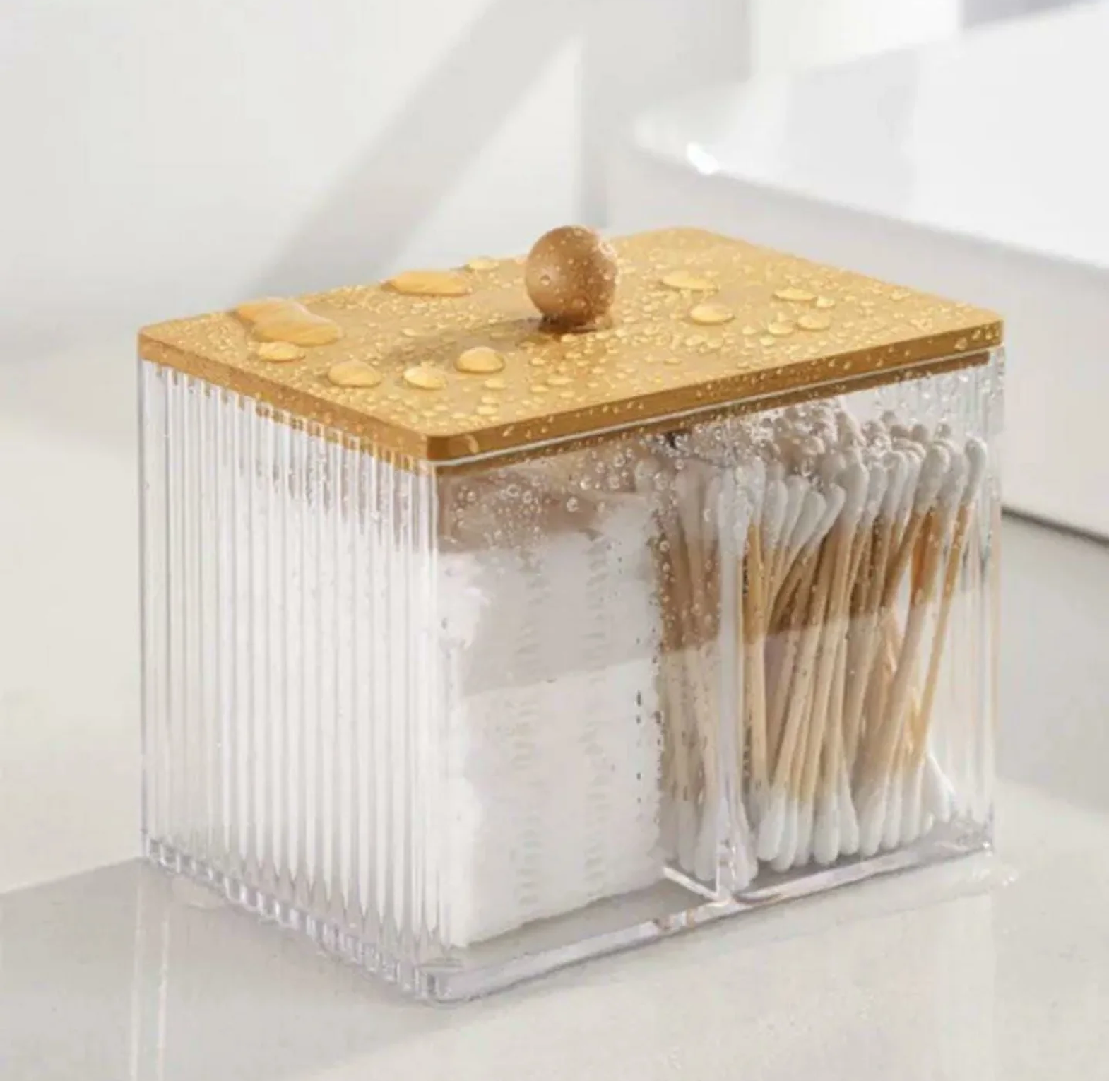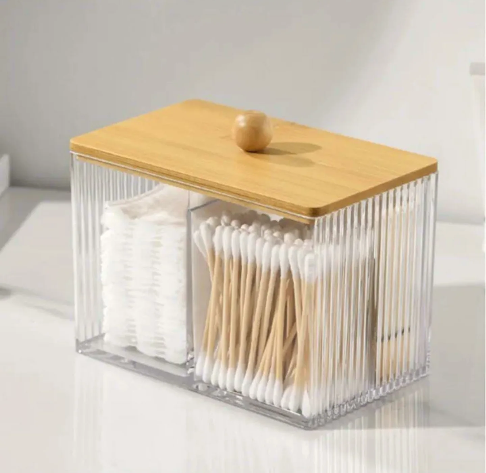 Keep your vanity or bathroom counter clutter-free with this partitioned acrylic organizer. It features a clear, fluted design and a natural bamboo cover for hygienic storage of earbuds, cotton swabs, and cotton pads.