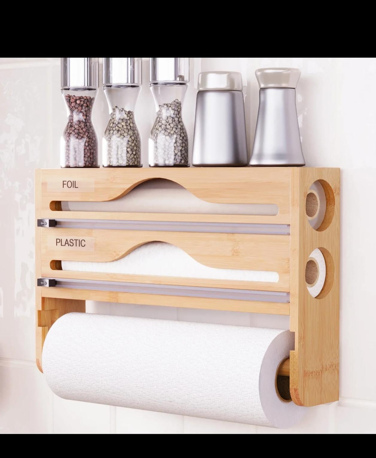 This custom solid bamboo organizer efficiently manages aluminum foil, plastic wrap, and paper towels in one stylish unit. It features integrated sliding cutters for clean, quick dispensing and is designed for convenient wall mounting to save counter space.