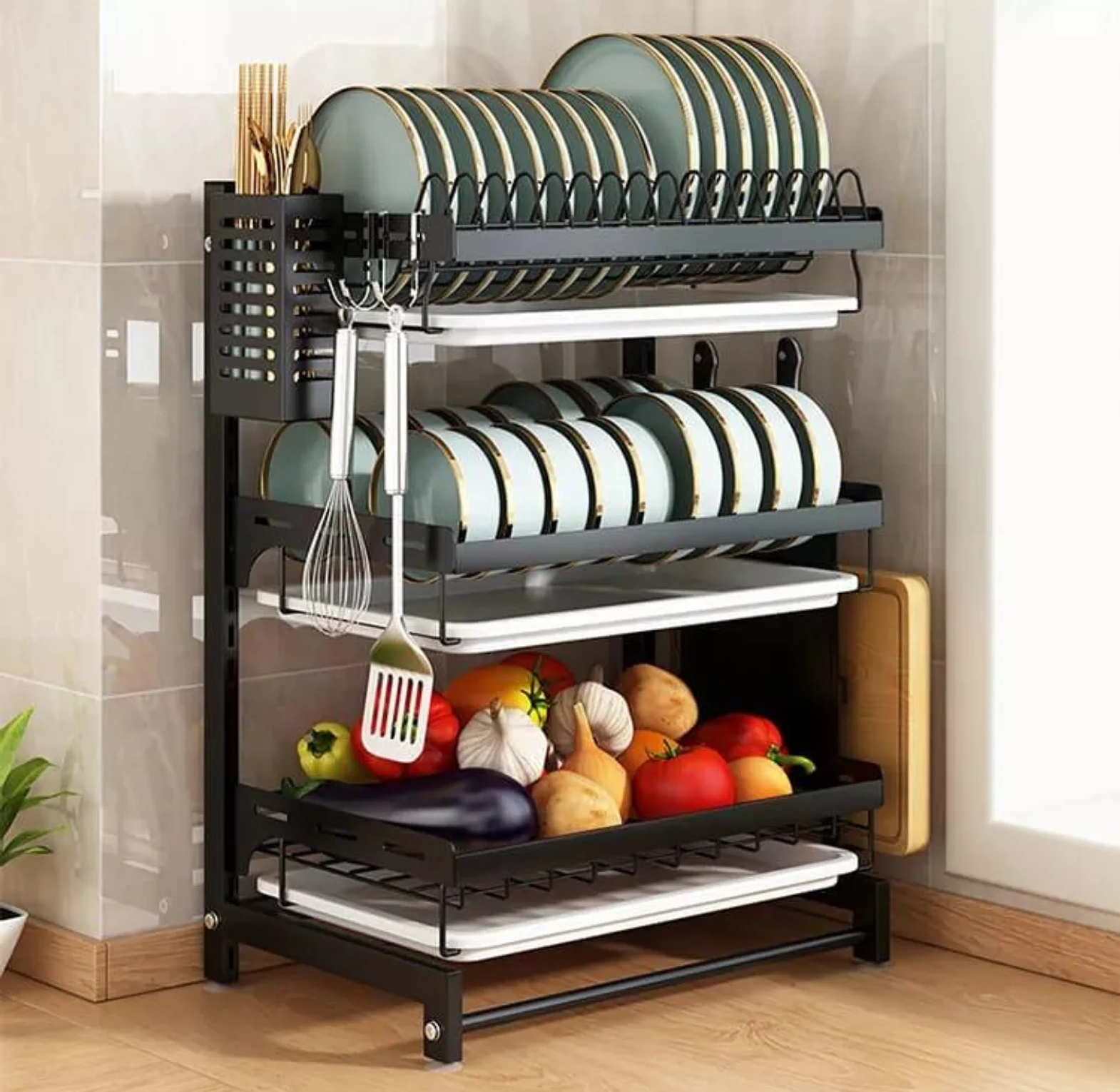 Optimize your kitchen counter with this heavy-duty 3-tier dish rack, featuring a vertical design that maximizes storage for all your dinnerware and fresh produce. Its sleek black finish, individual drip trays, and versatile attachments ensure a dry, organized, and stylish washing area.