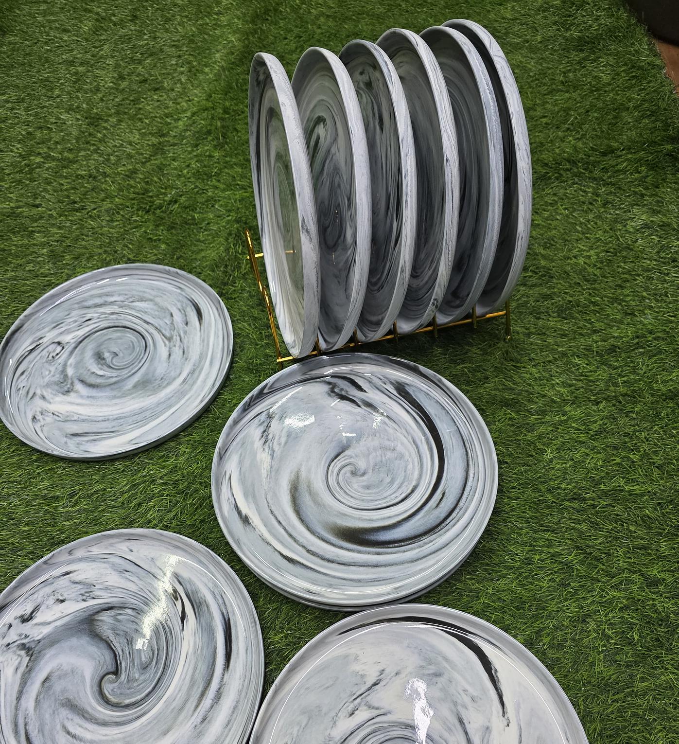 Serve dinner with dramatic flair using these premium marble porcelain plates, each featuring a unique, swirling grey and white design. They are both microwave and dishwasher safe, offering exceptional style without sacrificing everyday convenience.